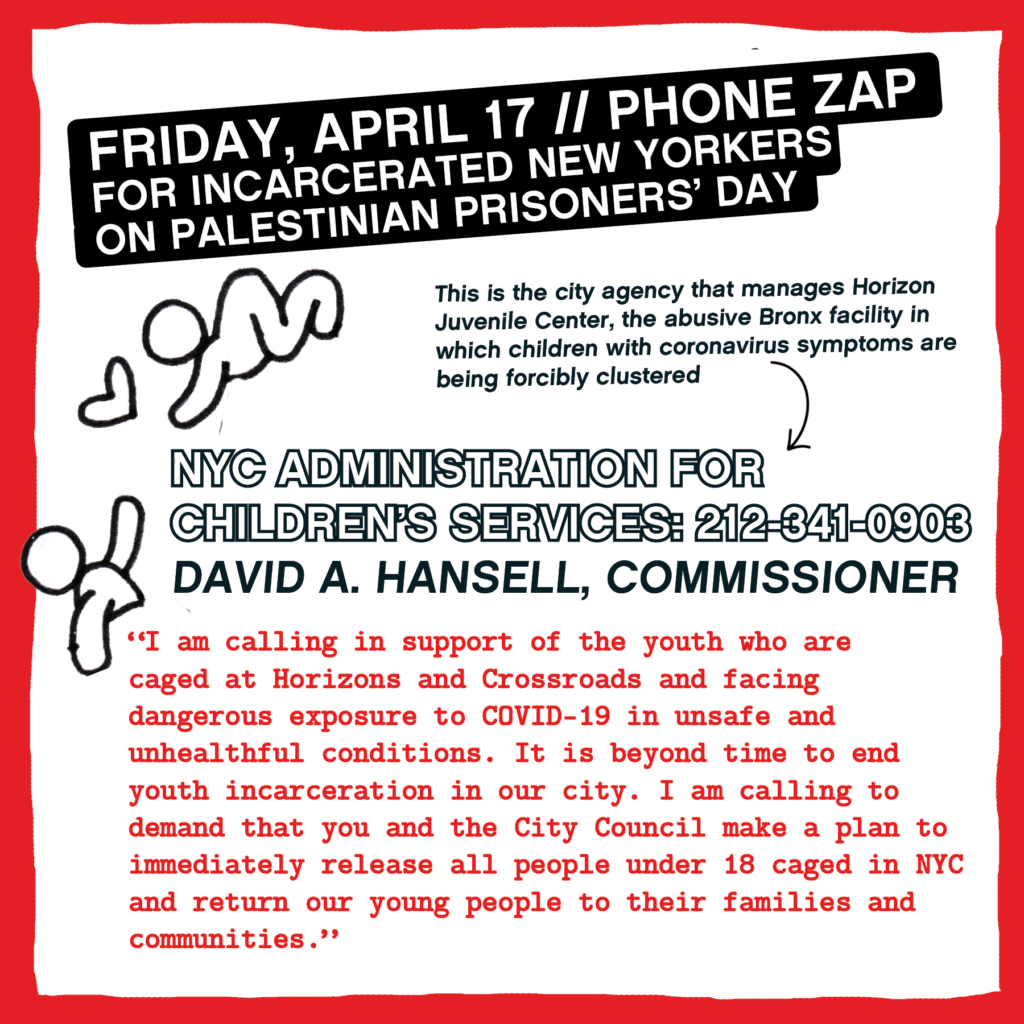 This is the city agency that manages Horizon Juvenile Center, the abusive Bronx facility in which children with coronavirus symptoms are being forcibly clustered! Tell Commissioner Hansell’s office: