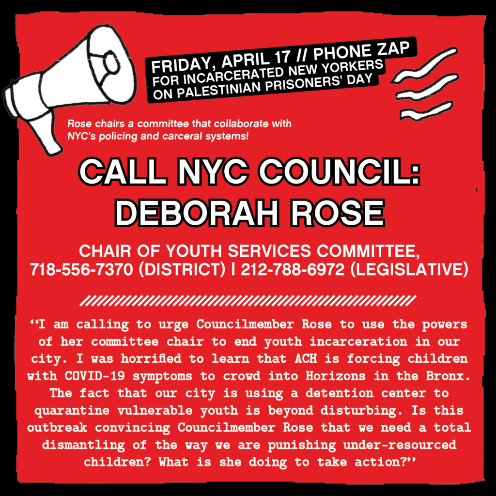 “I am calling to urge Councilmember Rose to use the powers of her committee chair to end youth incarceration in our city. I was horrified to learn that ACH is forcing children with COVID-19 symptoms to crowd into Horizons in the Bronx. The fact that our city is using a detention center to quarantine vulnerable youth is beyond disturbing. Is this outbreak convincing Councilmember Rose that we need a total dismantling of the way we are punishing under-resourced children? What is she doing to take action?”