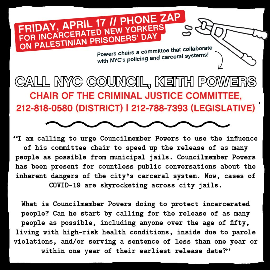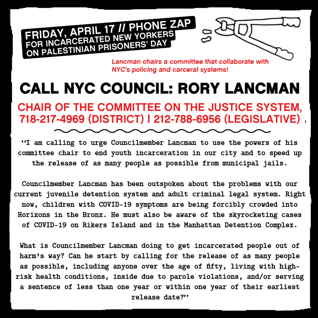 “I am calling to urge Councilmember Lancman to use the powers of his committee chair to end youth incarceration in our city and to speed up the release of as many people as possible from municipal jails. Councilmember Lancman has been outspoken about the problems with our current juvenile detention system and adult criminal legal system. Right now, children with COVID-19 symptoms are being forcibly crowded into Horizons in the Bronx. He must also be aware of the skyrocketing cases of COVID-19 on Rikers Island and in the Manhattan Detention Complex. What is Councilmember Lancman doing to get incarcerated people out of harm’s way? Can he start by calling for the release of as many people as possible, including anyone over the age of fifty, living with high-risk health conditions, inside due to parole violations, and/or serving a sentence of less than one year or within one year of their earliest release date?”