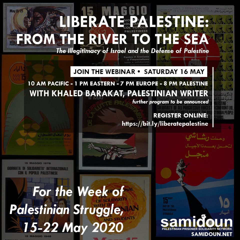 Register online to join us on ZOOM: https://bit.ly/liberatepalestine Event will also be livestreamed on the Samidoun facebook page at https://facebook.com/SamidounPrisonerSolidarity