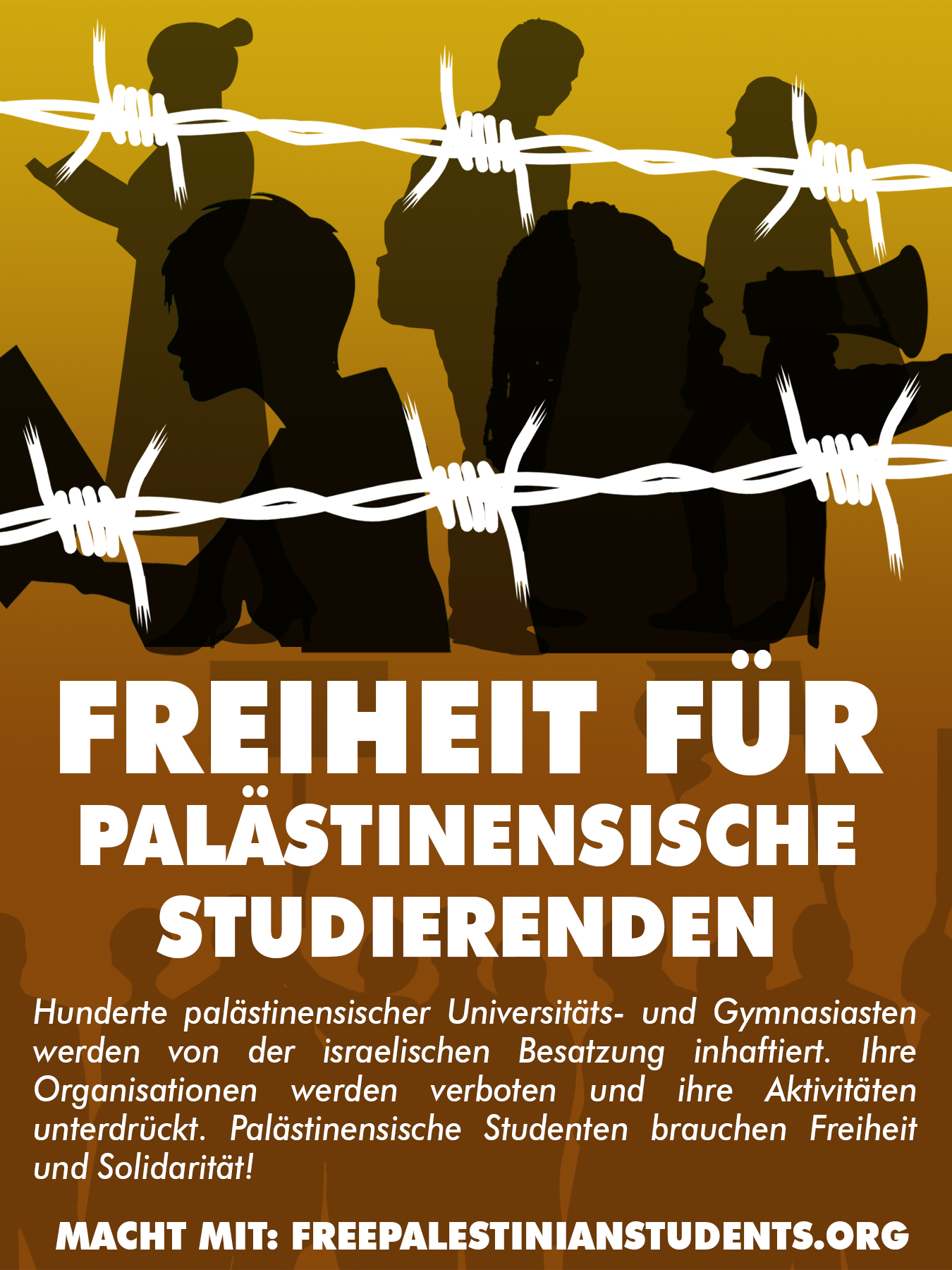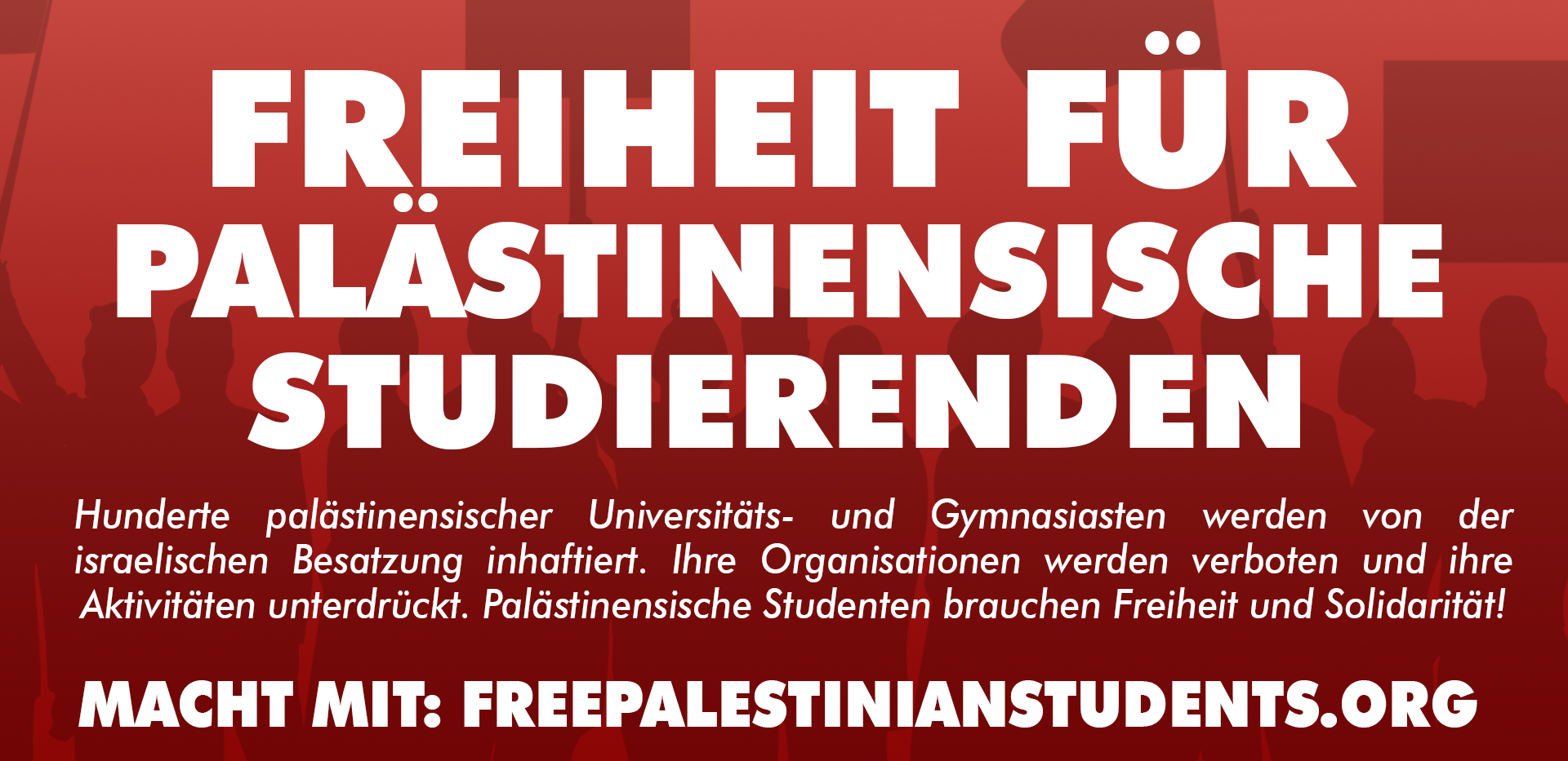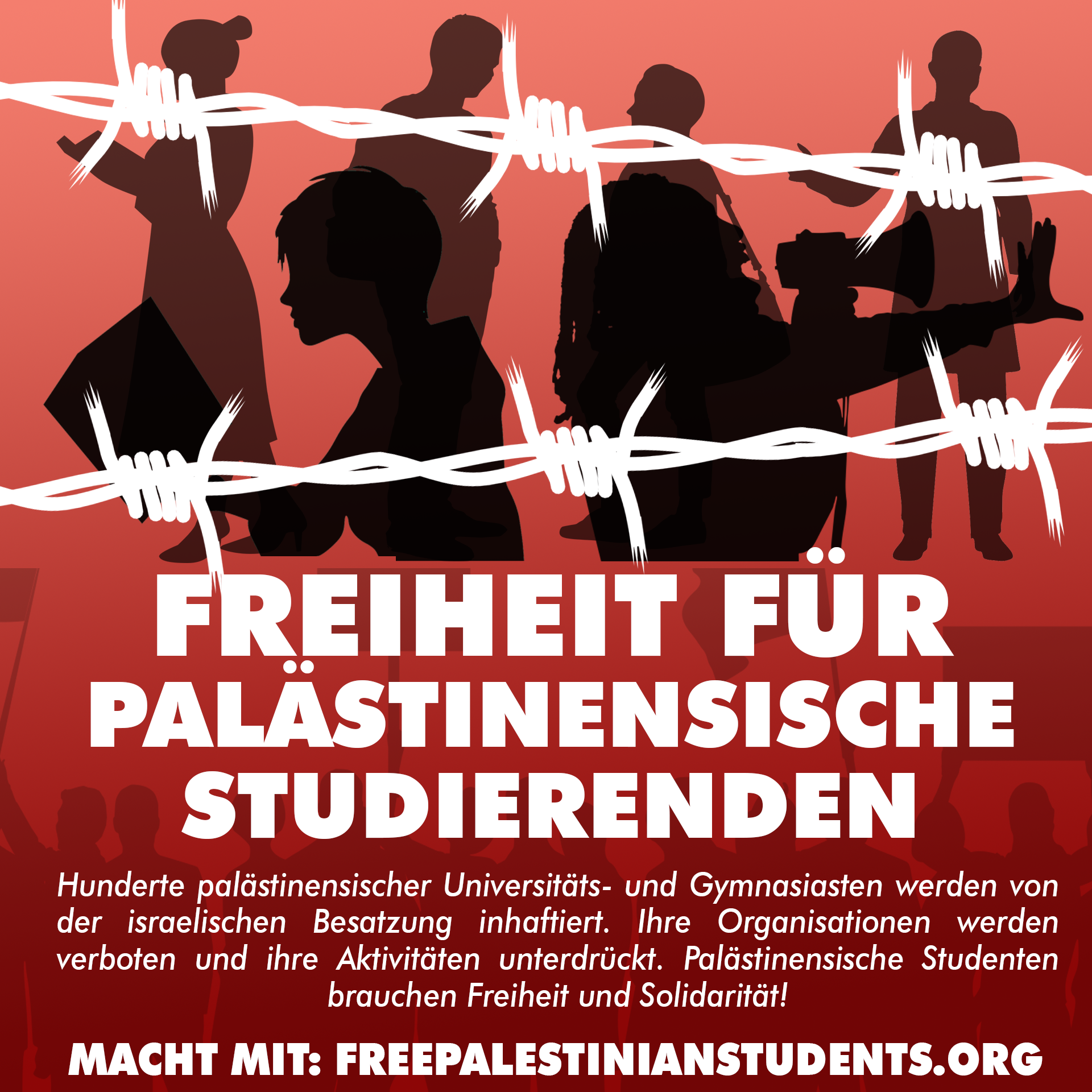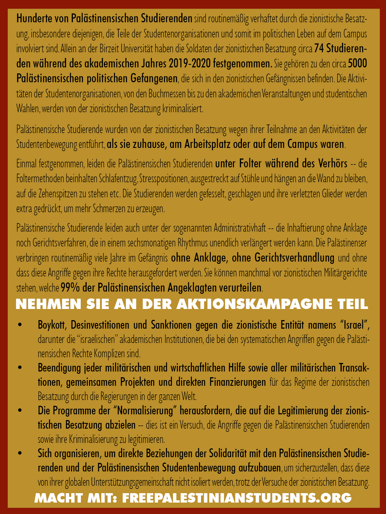Wir können nicht und wir müssen auch nicht schweigen über die Repression gegen die Palästinensische Studentenbewegung und gegen die einzelnen Palästinensischen Studierenden hinter den zionistischen Gittern. Wir stehen auf der Seite der Palästinensischen Studierenden!