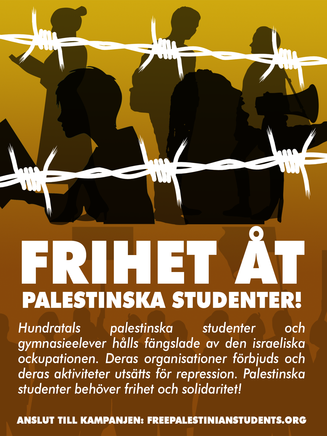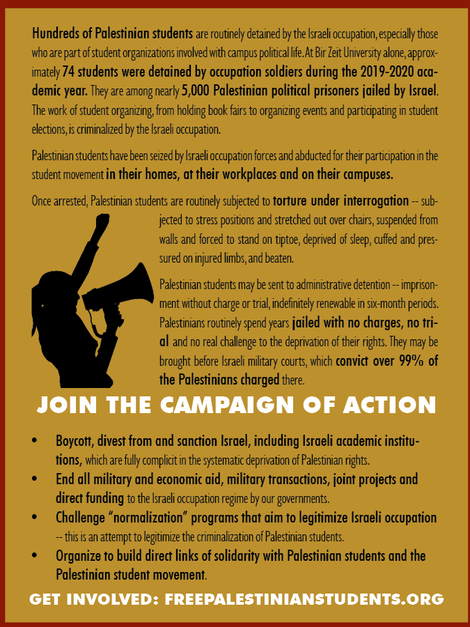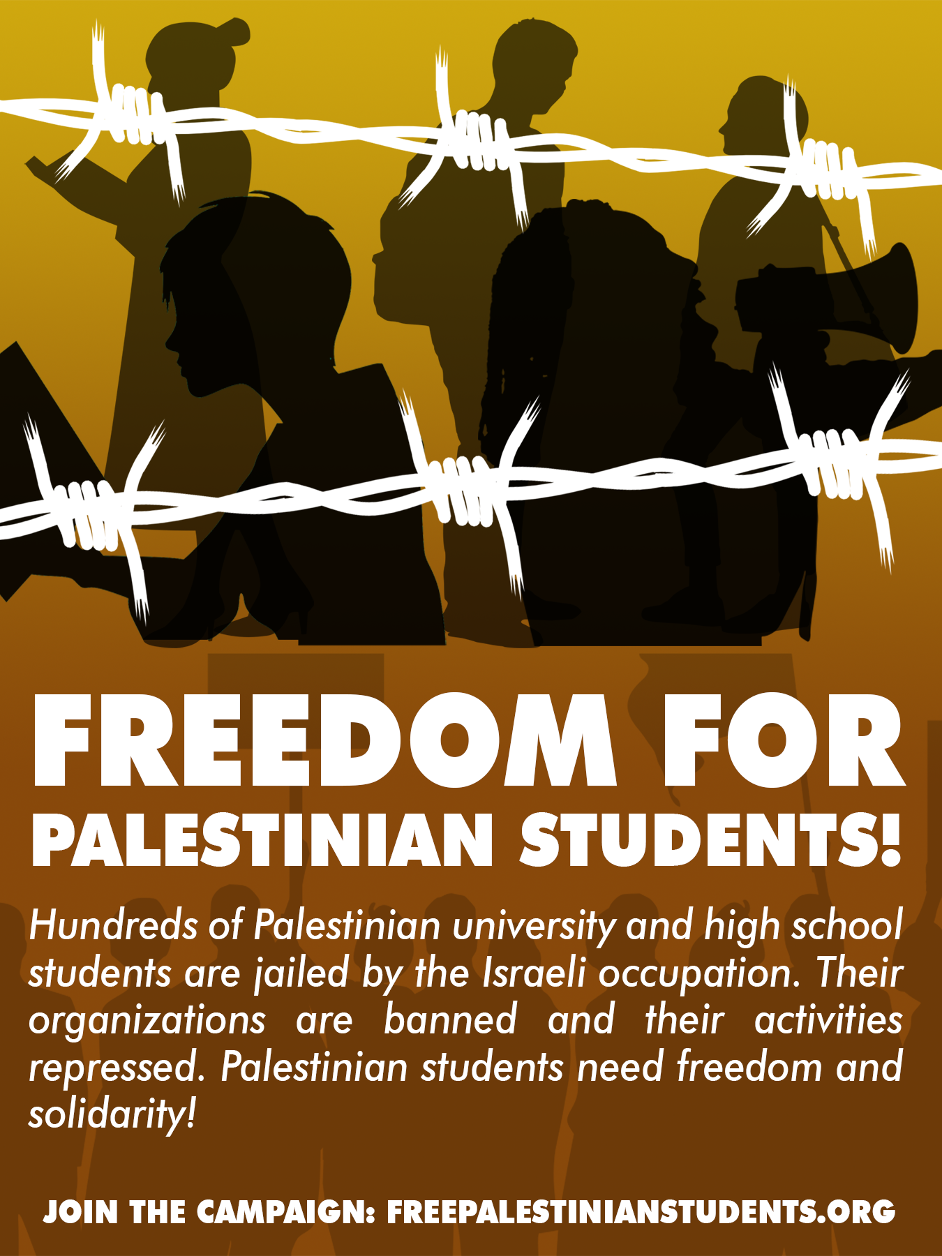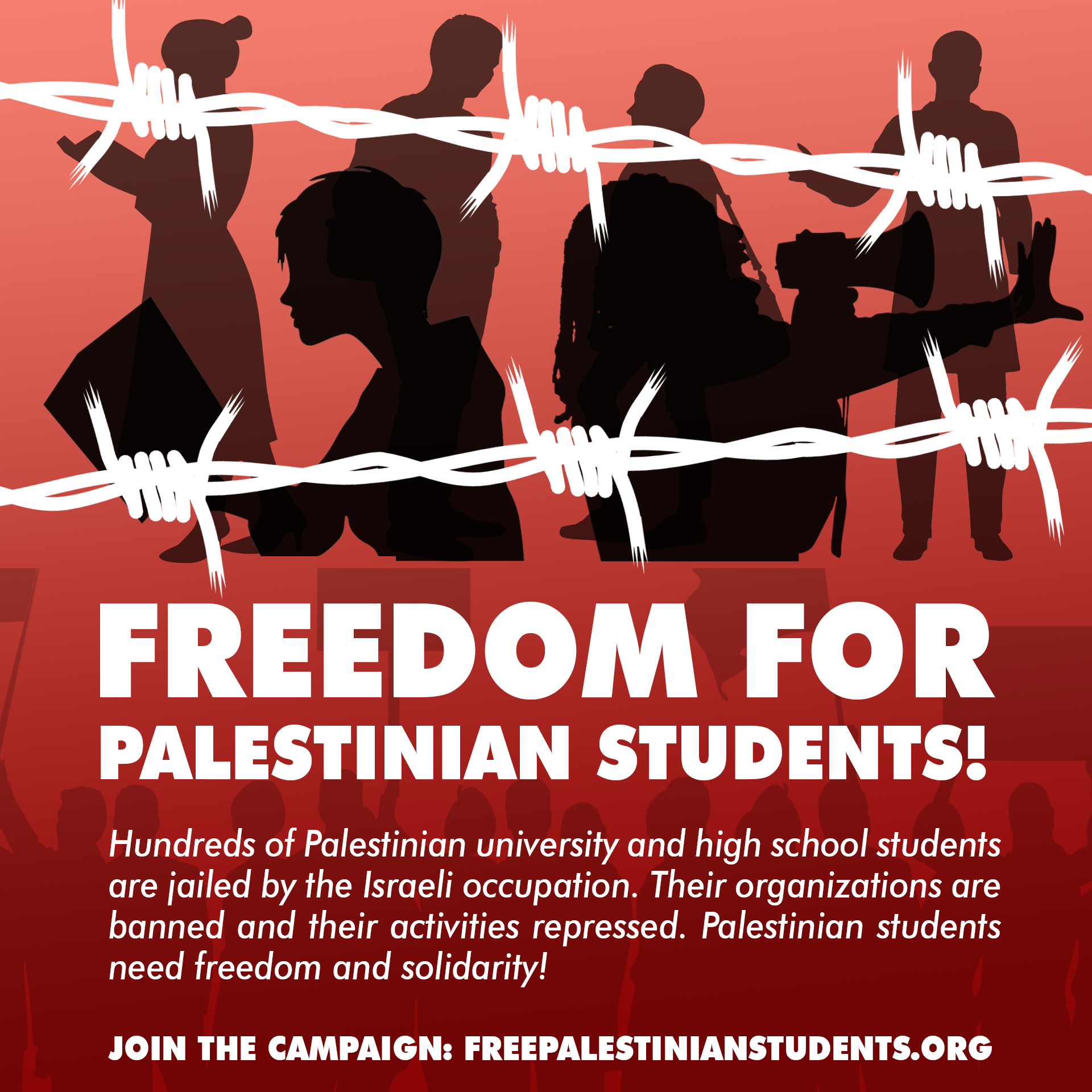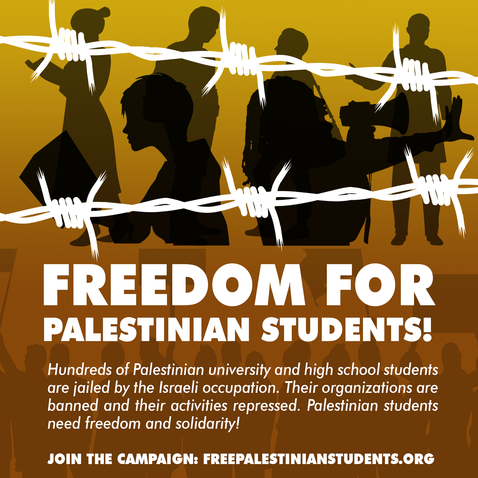 Vi, de undertecknade organisationerna, sluter samman våra röster i ett globalt upprop för fängslade palestinska studenters omedelbara frigivning och till försvar för palestinska studenters rätt till utbildning, till politiskt uttryck och engagemang och till att avgöra sin egen framtid. Den israeliska ockupation förföljer palestinska studenter och, i synnerhet, den palestinska studentrörelsen och palestinska studentorganisationer med sträng repression och politiskt fångenskap.