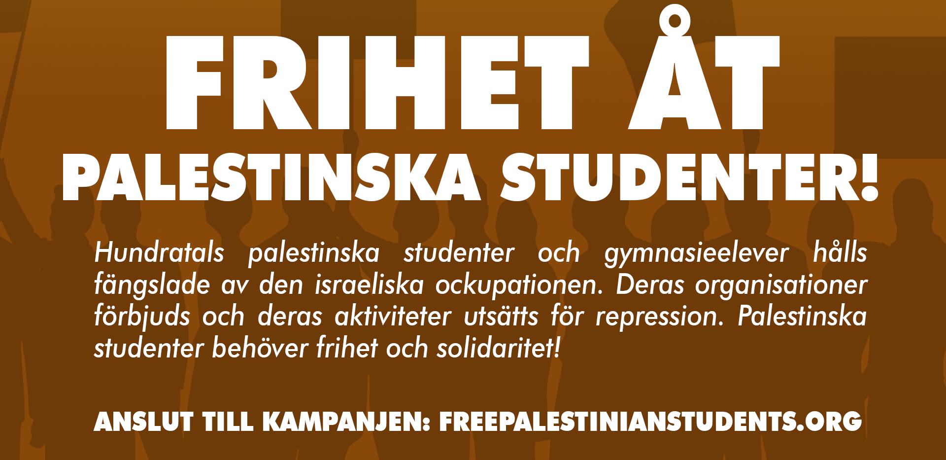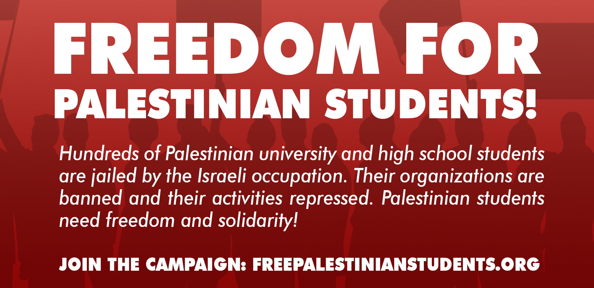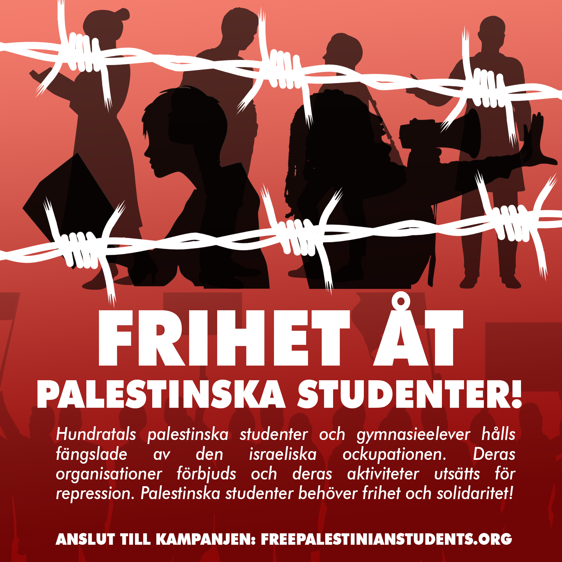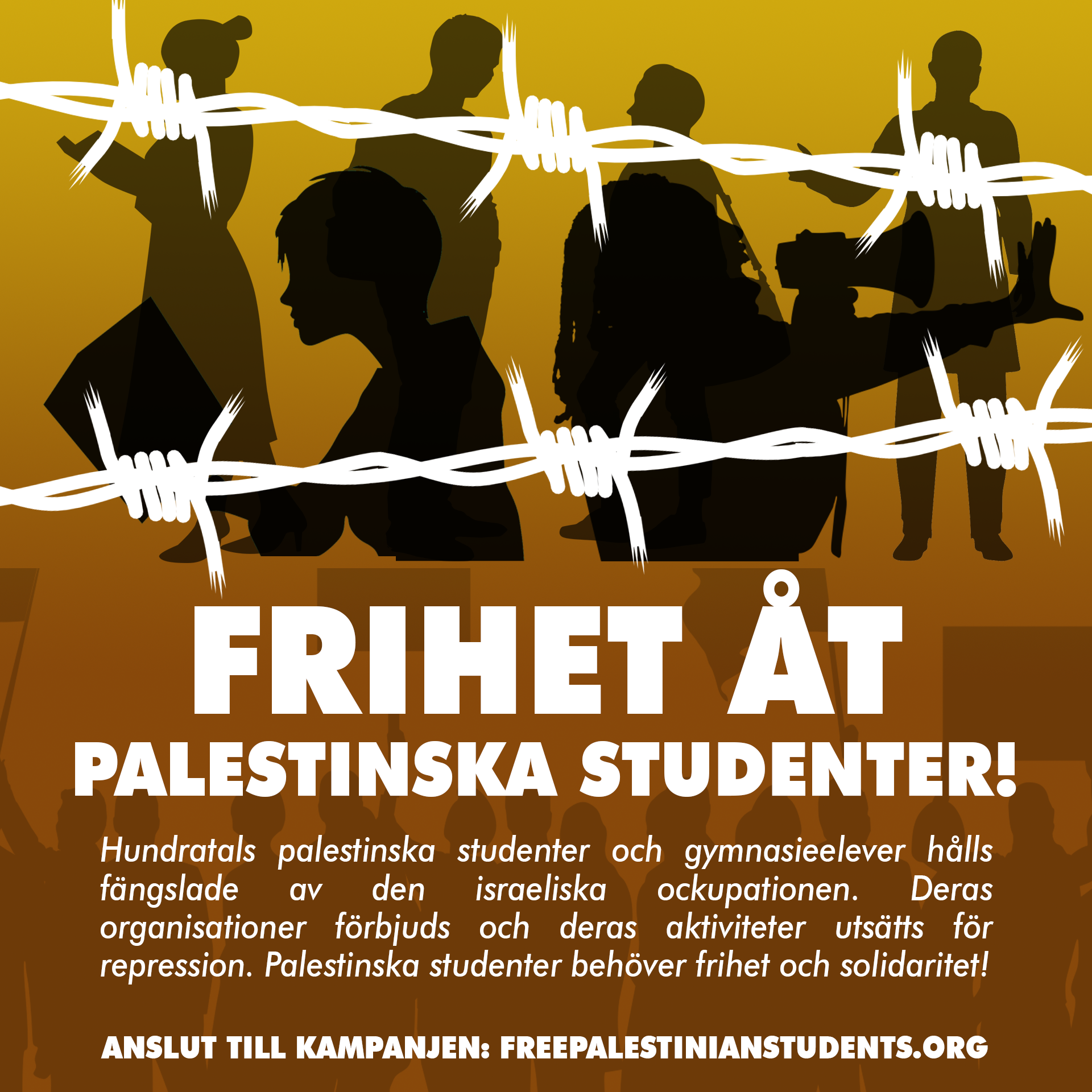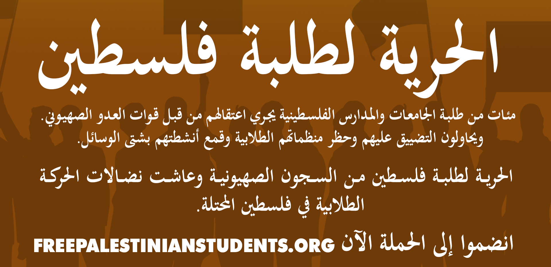 Vi, de undertecknade organisationerna, sluter samman våra röster i ett globalt upprop för fängslade palestinska studenters omedelbara frigivning och till försvar för palestinska studenters rätt till utbildning, till politiskt uttryck och engagemang och till att avgöra sin egen framtid. Den israeliska ockupation förföljer palestinska studenter och, i synnerhet, den palestinska studentrörelsen och palestinska studentorganisationer med sträng repression och politiskt fångenskap.