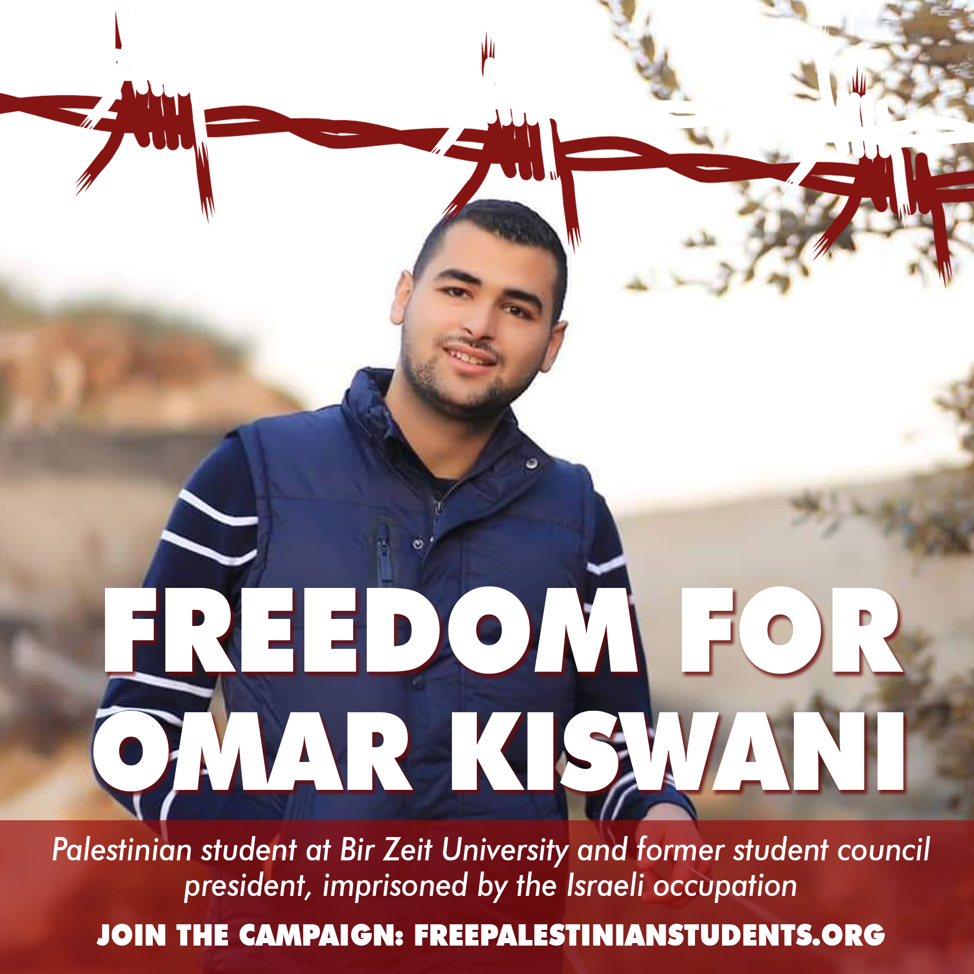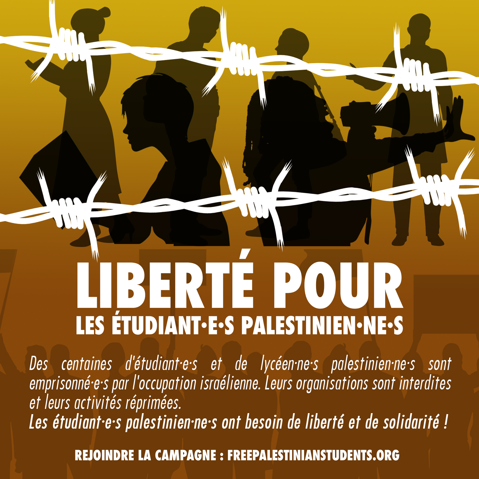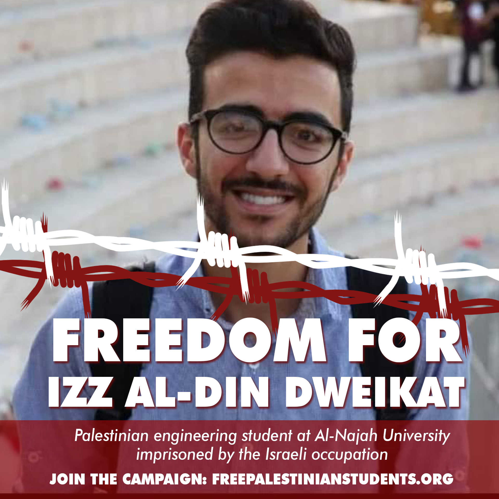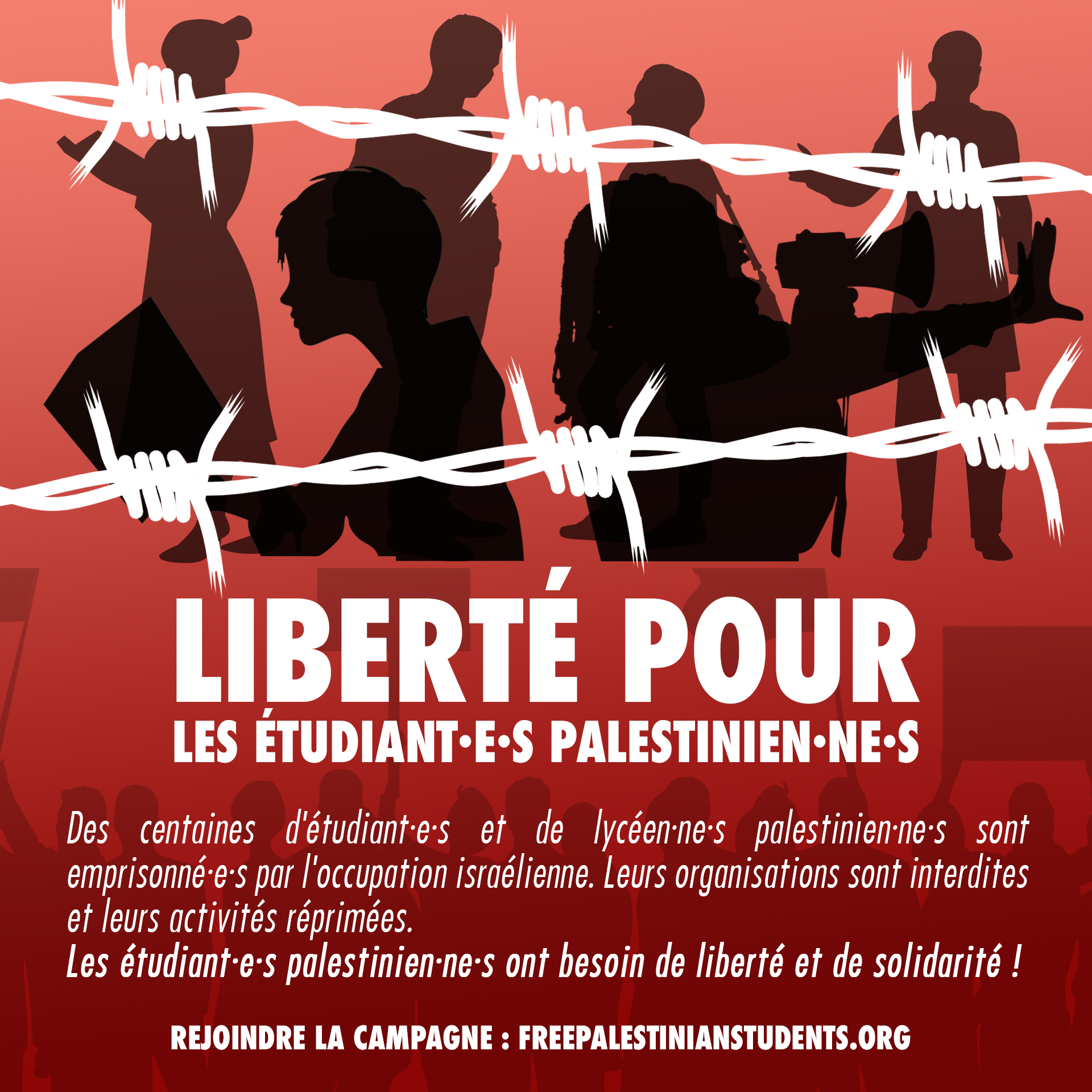 Vi, de undertecknade organisationerna, sluter samman våra röster i ett globalt upprop för fängslade palestinska studenters omedelbara frigivning och till försvar för palestinska studenters rätt till utbildning, till politiskt uttryck och engagemang och till att avgöra sin egen framtid. Den israeliska ockupation förföljer palestinska studenter och, i synnerhet, den palestinska studentrörelsen och palestinska studentorganisationer med sträng repression och politiskt fångenskap.
