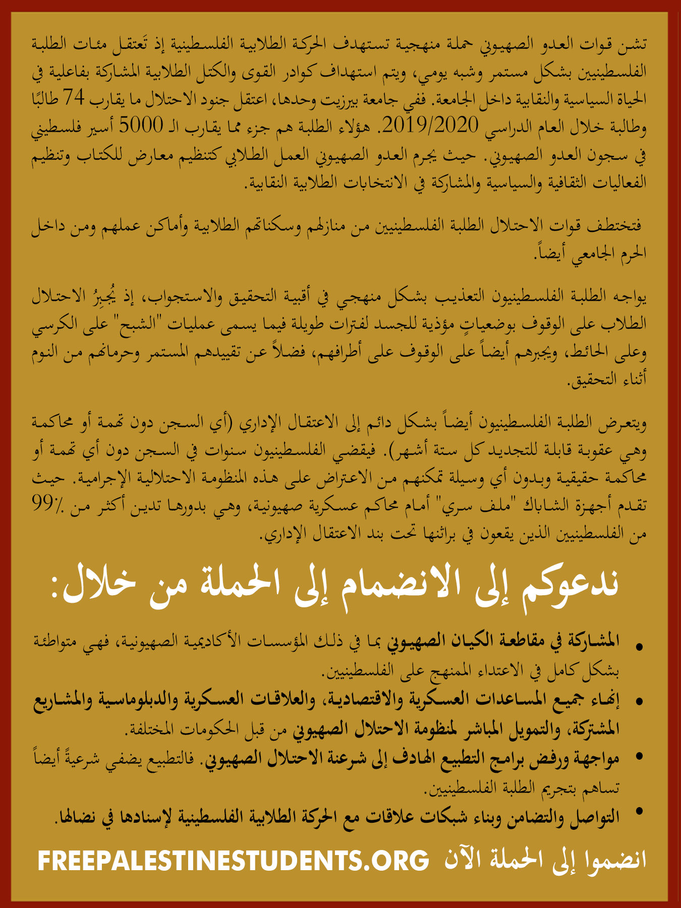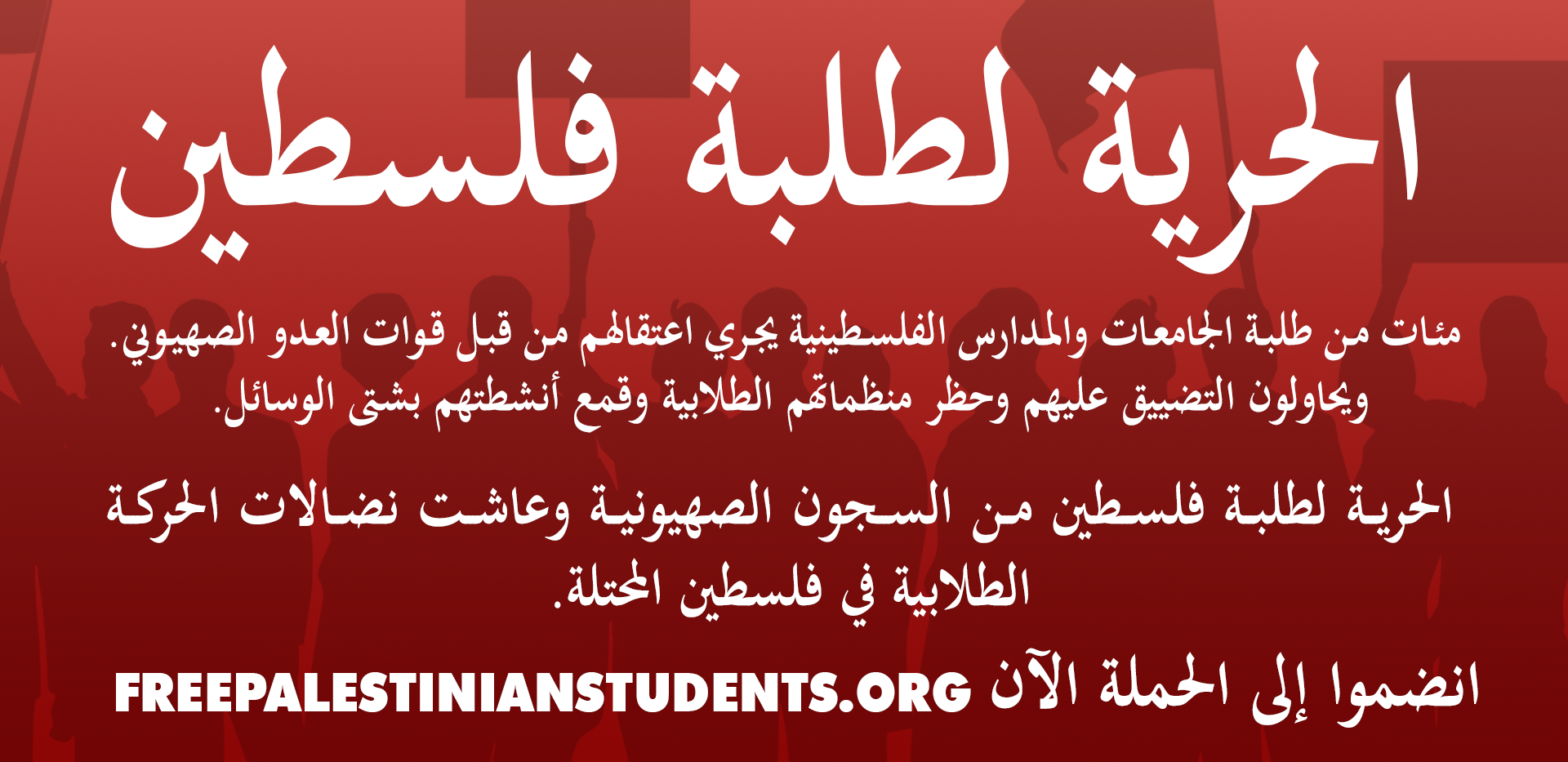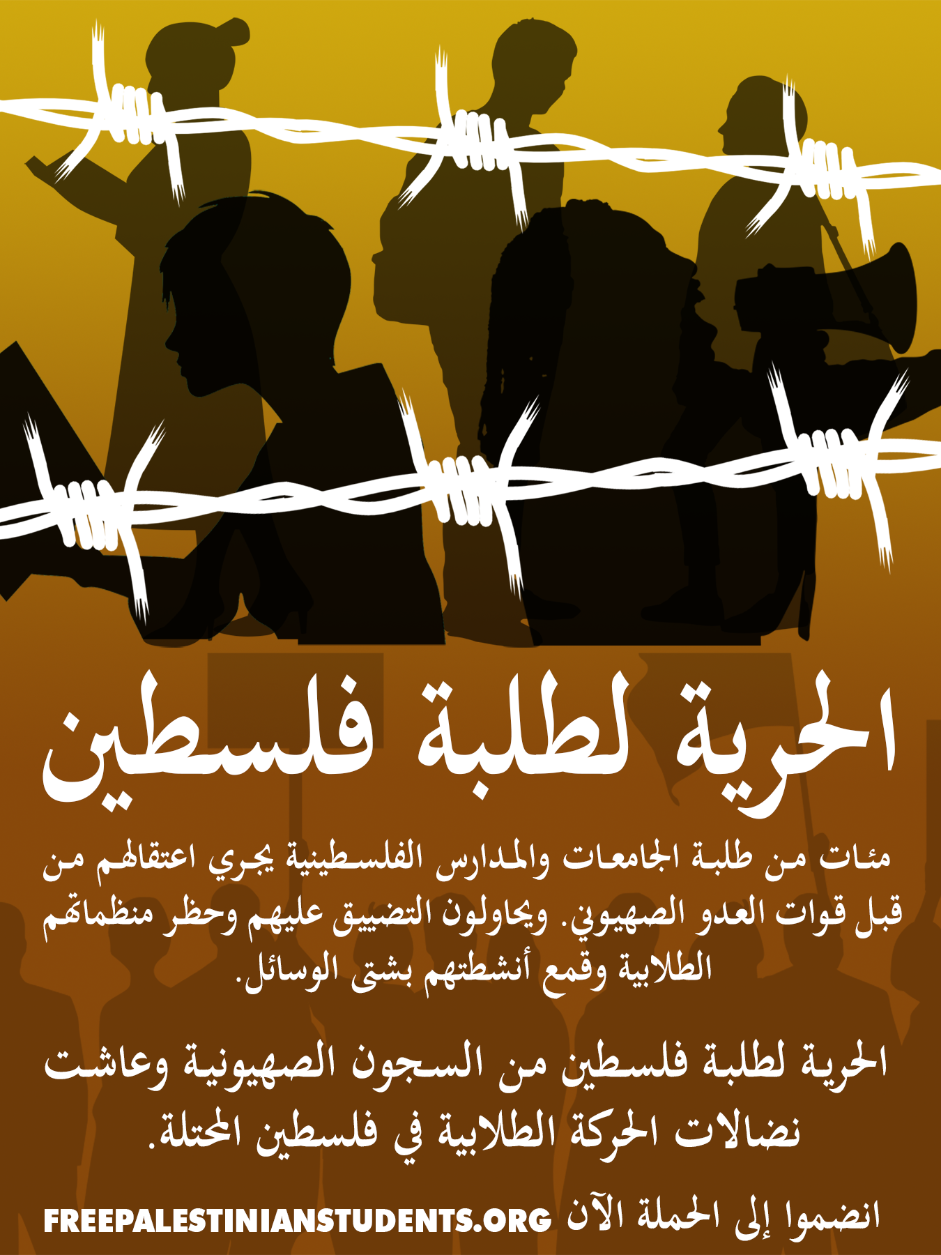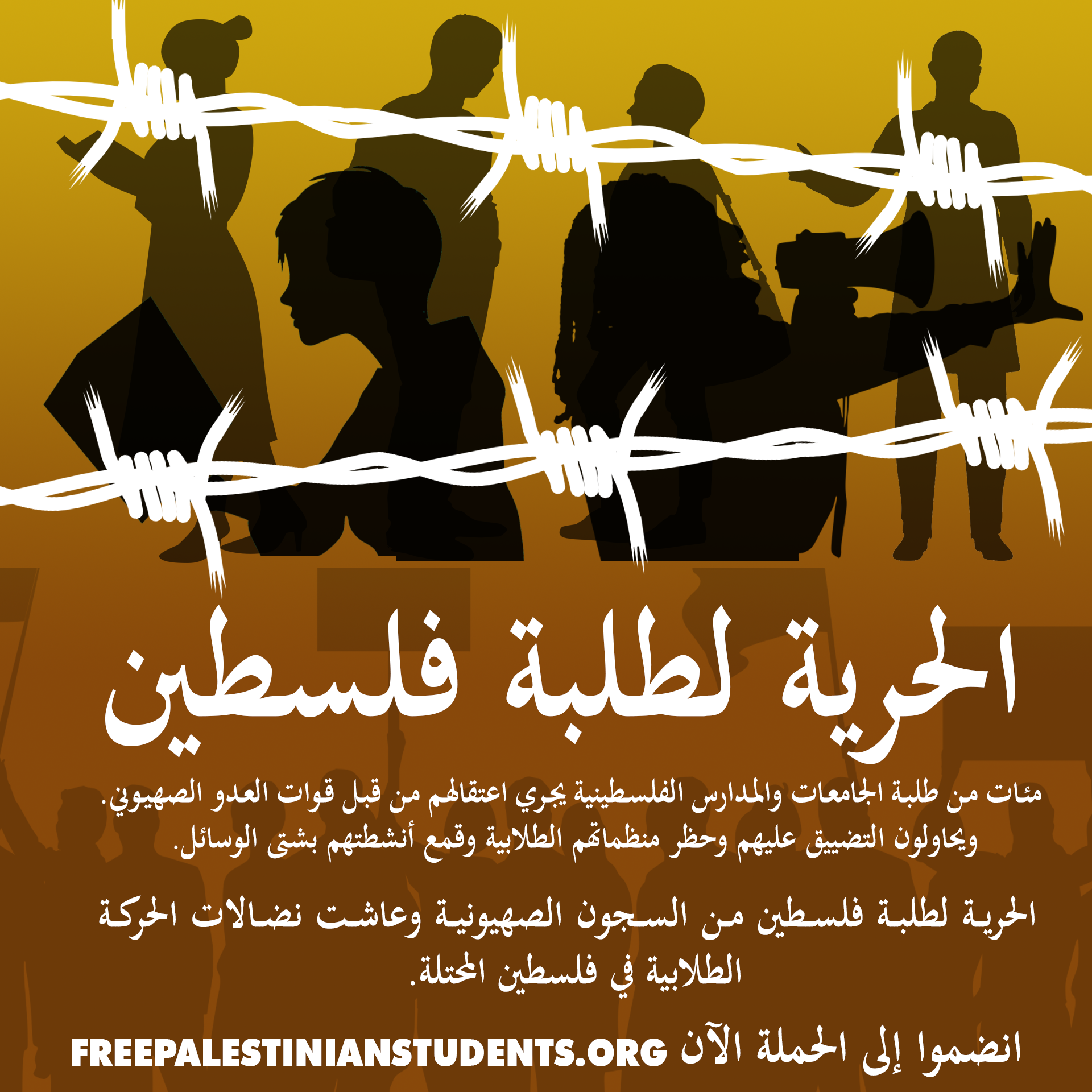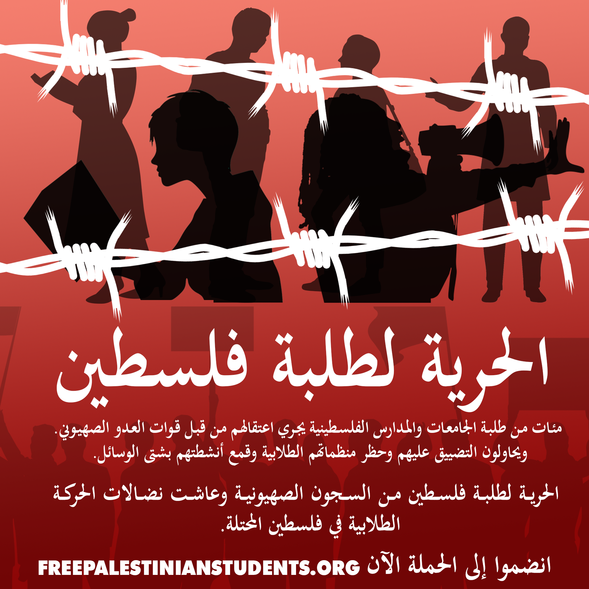نحن، المنظمات الموقعة أدناه، نضم أصواتنا معًا في دعوة عالمية للسعي إلى تحقيق الحرية الفورية للطلبة الفلسطينيين الأسرى في سجون العدو الصهيوني، وحماية حق الطلبة الفلسطينيين في التعليم، وحقهم في التعبير والمشاركة السياسية، والحق في تقرير مستقبلهم. حيث يستهدف العدو الصهيوني الطلبة الفلسطينيين وبالأخص المنخرطين الحركة الطلابية الفلسطينية والمنظمات الطلابية الفلسطينية بشتى وسائل القمع وحملات الاعتقال والعنف والترهيب.
