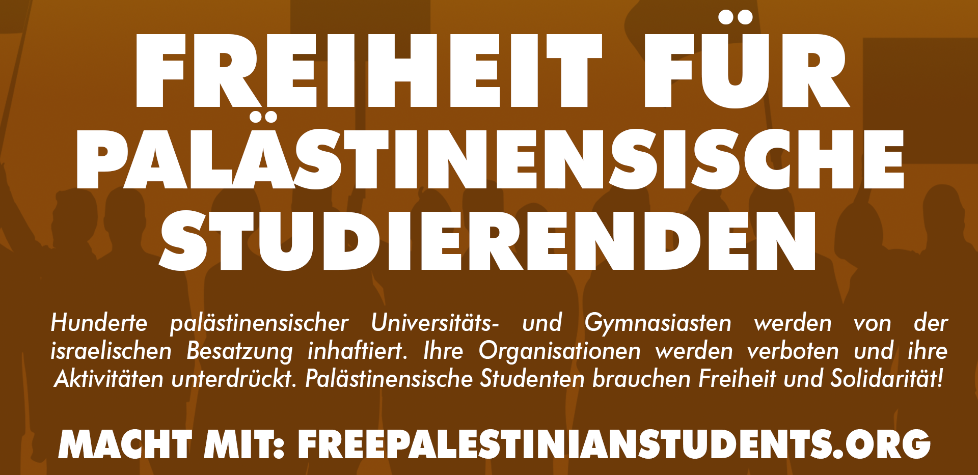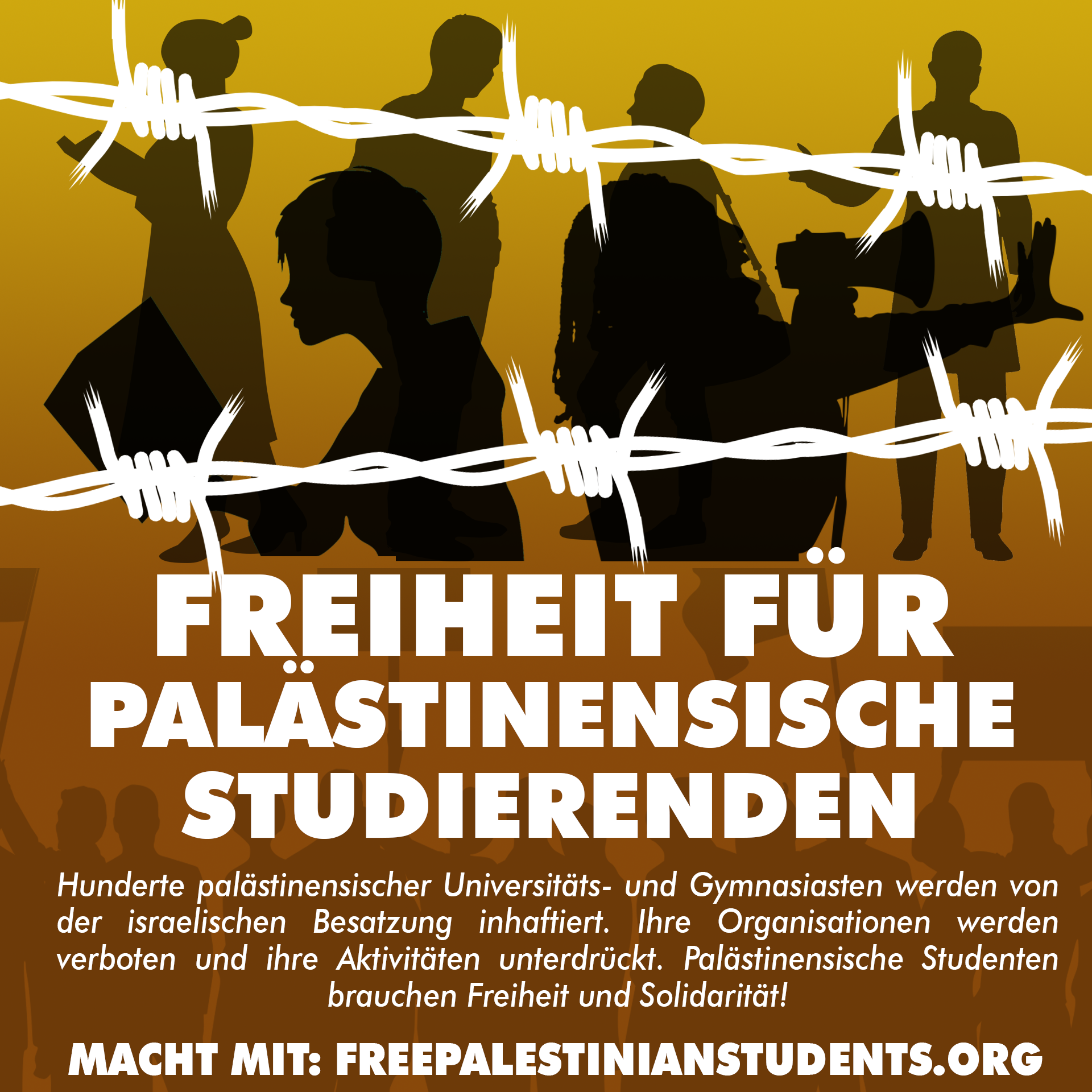 Wir, die unten unterschreibenden Organisationen, erheben gemeinsam unsere Stimmen in einem globalen Aufruf, um die sofortige Freilassung der gefangenen Palästinensischen Studierenden zu verlangen, sowie um die Rechte der Palästinensischen Studierenden zu verteidigen, nämlich das Recht auf Bildung, das Recht auf politische Äußerung und politisches Engagement und das Recht darauf, die eigene Zukunft zu bestimmen. Die zionistische Besatzung hat die Palästinensischen Studierenden ständig angegriffen, insbesondere die Palästinensische Studentenbewegung und die Palästinensischen Studentenorganisationen mit gewalttätiger Repression und politischer Festnahme und Inhaftierung.