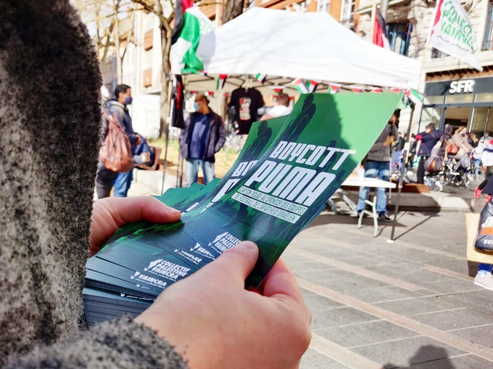 Despite strong winds, participants distributed hundreds of flyers calling for a boycott of Puma and had dozens of discussions with passers-by. At the same time, the Collectif Palestine Vaincra booth provided documents with lists of Israeli products to boycott, the situation of Palestinian prisoners and the history of Zionist colonization of Palestine. Many people expressed their interest and volunteered to participate in upcoming initiatives.