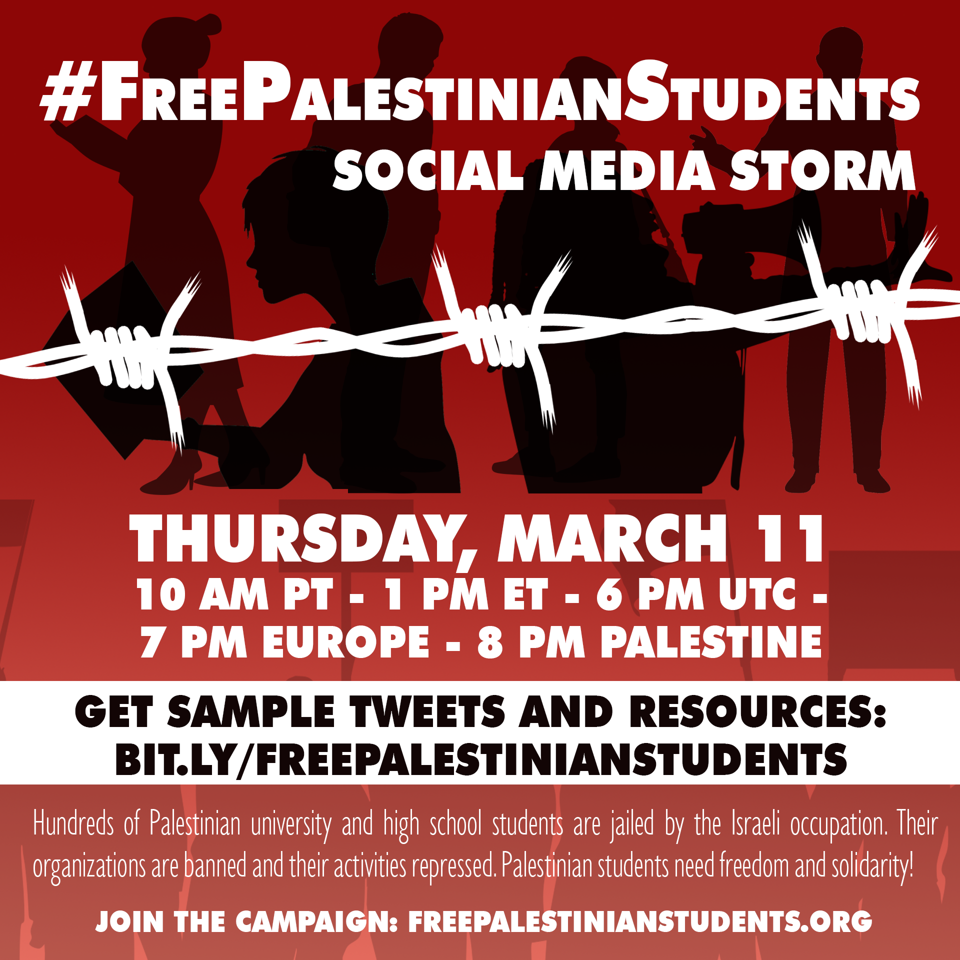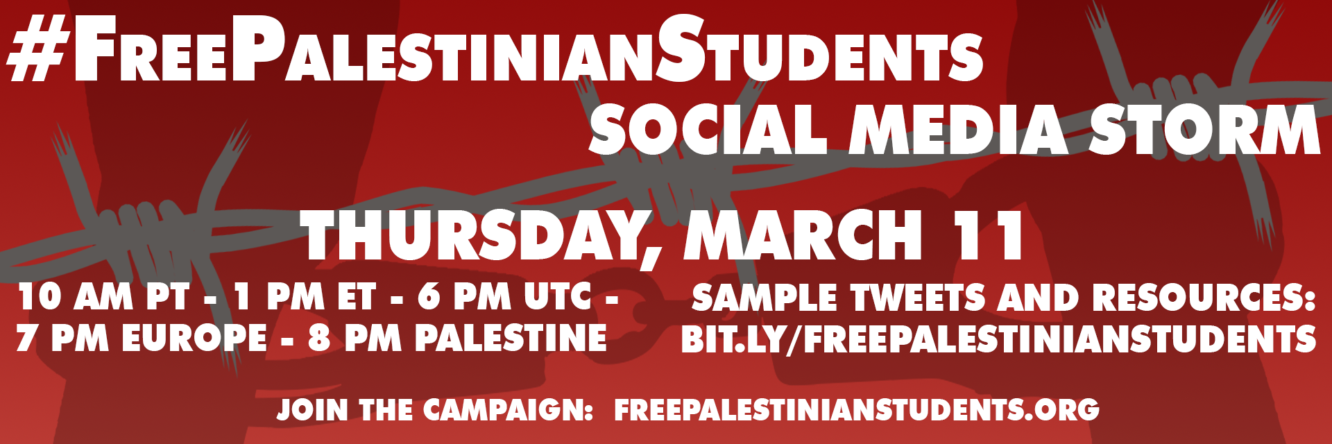 Join the #FreePalestinianStudents campaign – supported by over 300 organizations around the world – for a social media action and Twitter storm on Thursday, 11 March!