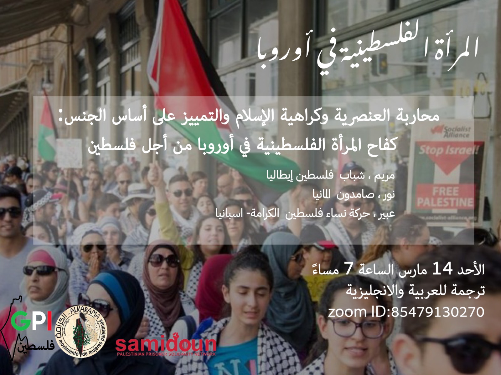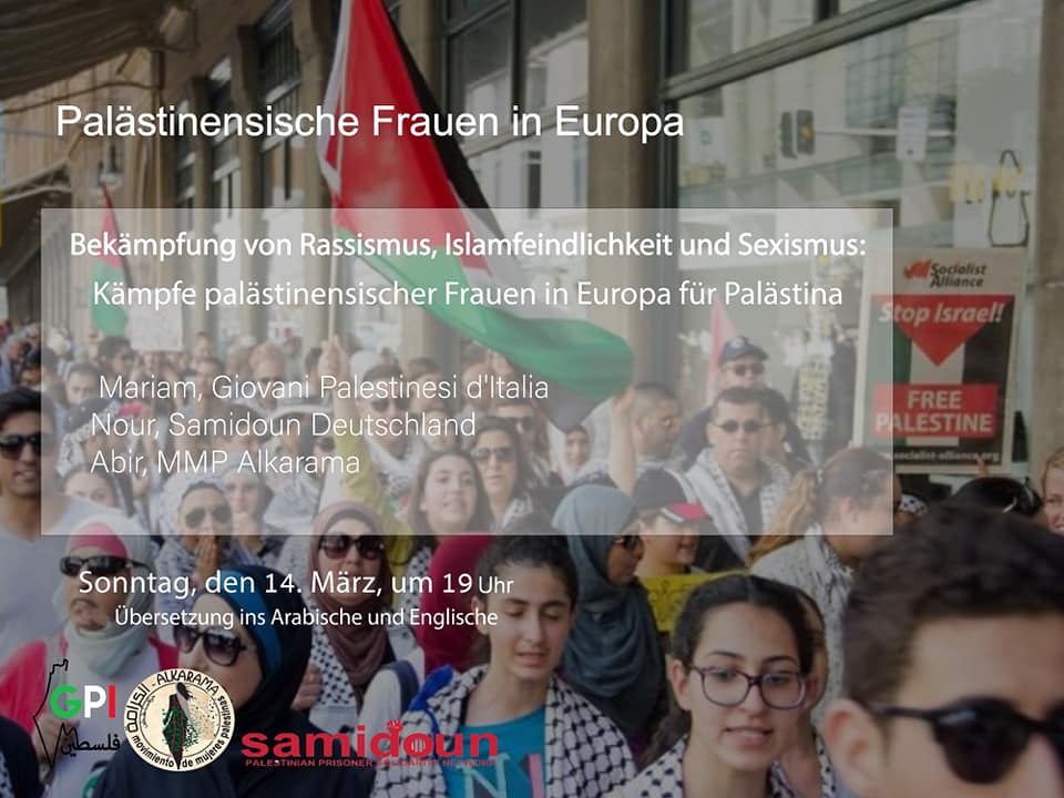 Die palästinensischen Frauen auf dem europäischen Kontinent stehen vor verschiedenen Herausforderungen, aber sie haben auch Wege entwickelt, sich zu organisieren und weiter für die Befreiung und Rückkehr zu kämpfen. Wir laden euch zu dieser Veranstaltung ein, bei der wir junge Palästinenserinnen aus Italien, Deutschland und Spanien anhören werden. Palästinensische Frauen in EuropaBekämpfung von Rassismus, Islamofeindlichkeit und Sexismus: Die verschiedenen Kämpfe der palästinensischen Frauen in Europa