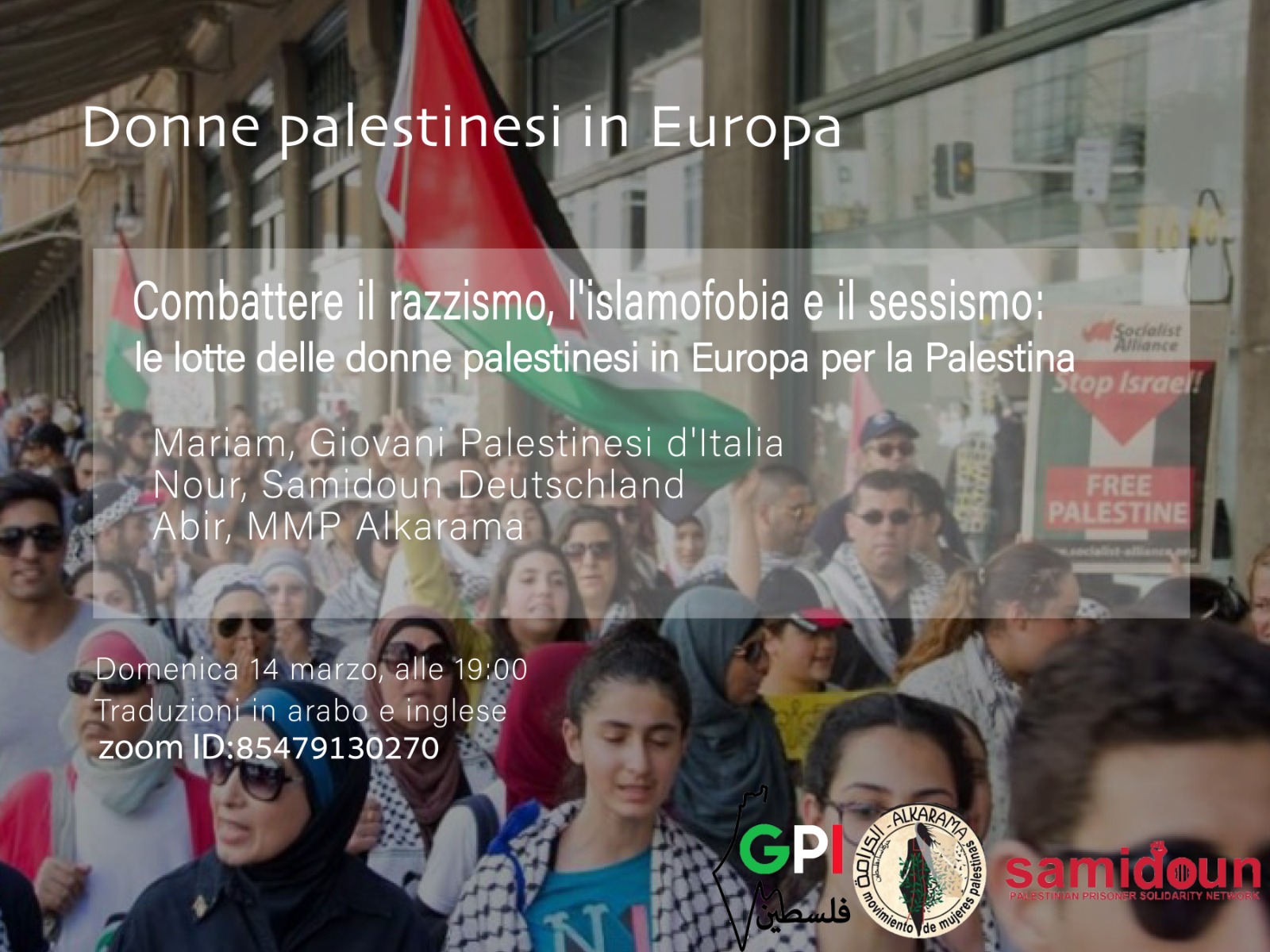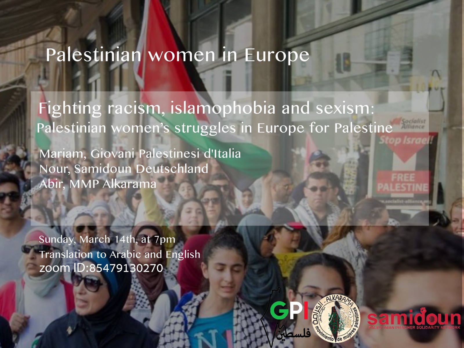 Palestinian women in Europe face multiple challenges, but they have also developed ways to get organized and continue fighting for liberation and return. We invite you to this event where we will listen to young Palestinian women from Italy, Germany and Spain discussing the various struggles of Palestinian women in Europe