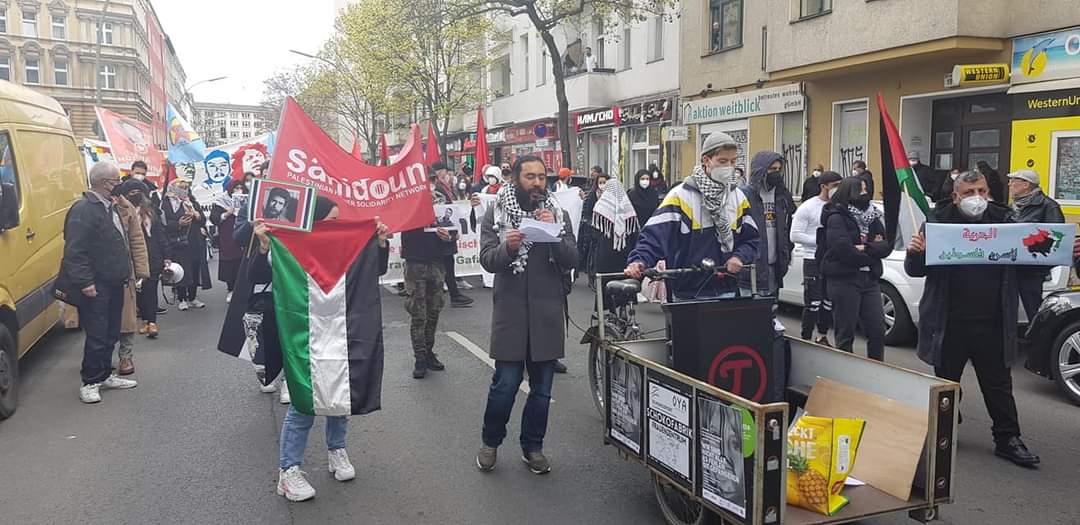 Today, from Berlin, we declare clearly: The prisoners’ movement represents all of us, so today, when we raise our voices for their freedom, we are also calling out for the people of Ain el-Helweh, Yarmouk, Neirab, Wehdat, Bourj al-Barajneh and Beddawi camps… We are continuing our struggle with them today, continuing the march of the revolution, liberation and return, the march of the revolutionary struggle, from the legacy of the martyrs and wounded who struggled in Palestine in 1936, who struggled in Palestine in 1936, in Beirut, in the Jordan Valley, in the Golan, and who were martyred on the borders of Palestine…”