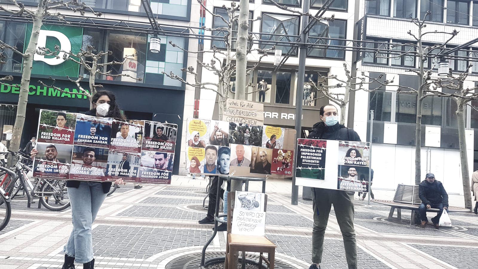 In Frankfurt, members of Samidoun Deutschland organized a public display on the imprisonment of Palestinian students, with large posters and collages of the photos of jailed students in Israeli prisons. They set up a wooden chair to illustrate the stress positions and forms of torture used by Israeli interrogators against Palestinian students and other political prisoners.
