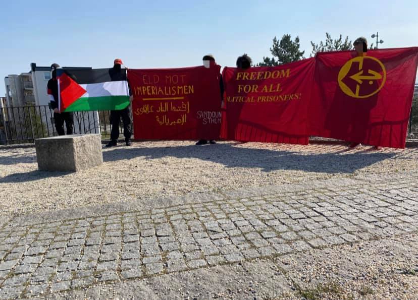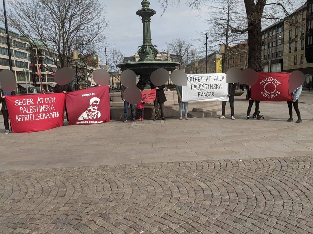 In Gothenburg, Sweden, Samidoun Göteborg joined with anti-imperialist organizations for a banner display and public action on Saturday, 17 April, marking Palestinian Prisoners’ Day. They distributed information and displayed banners and posters calling for the liberation of Georges Abdallah, all Palestinian prisoners, and liberation for Palestine.