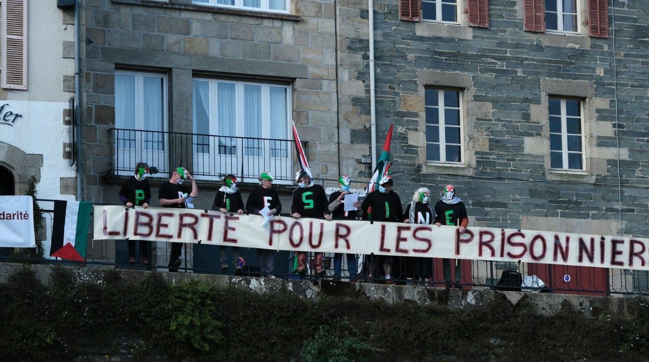 On 17 April in Pays de Morlaix, France, the AFPS (Association France-Palestine Solidarite) organized a large display and street theater performance highlighting Palestinian Prisoners’ Day. They displayed a banner demanding freedom for Palestinian prisoners above the town market and read out testimonies from imprisoned Palestinians.