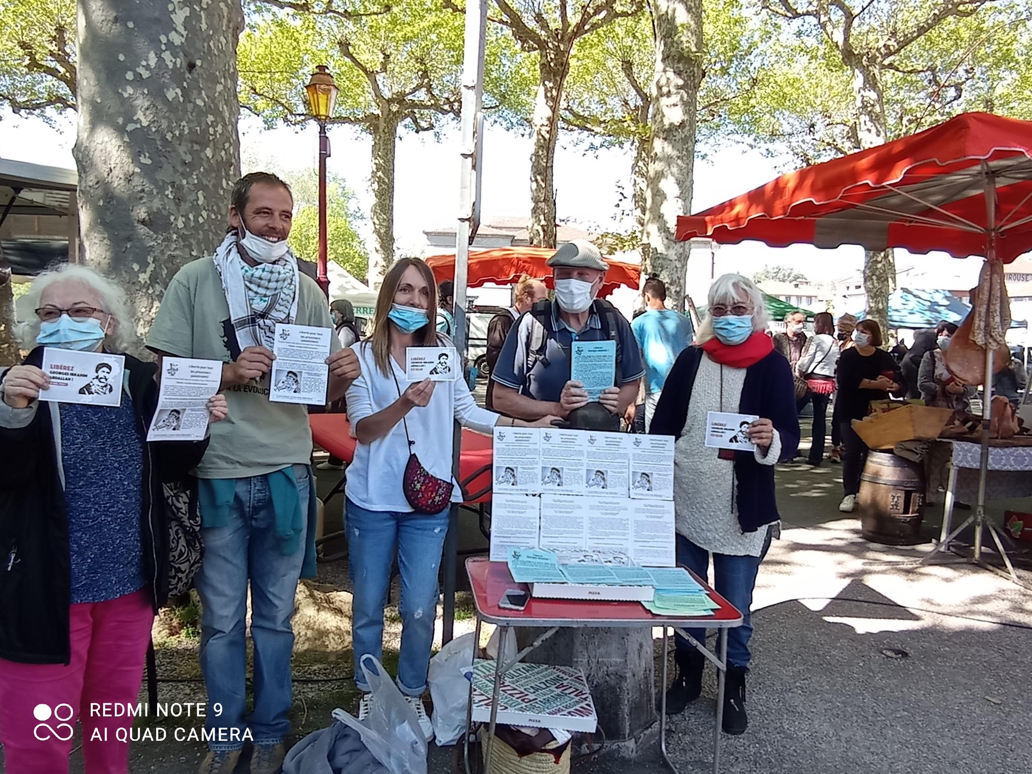 In Saint Girons, France, Couserans-Palestine organized a table at the Market on Saturday, 24 April, highlighting Palestinian prisoners’ struggle for freedom. They distributed information about Palestinian political prisoners, administrative detention without charge or trial and the Israeli apartheid regime in Palestine.