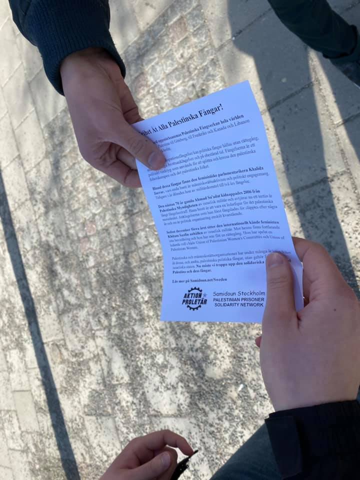 Also on 17 April, in Stockholm, Sweden, Samidoun Stockholm, together with Aktion Proletär Järva and Rojavakommittéerna Stockholm, organized a public action for Palestinian Prisoners’ Day. They distributed leaflets and information and delivered a speech: “Freedom for Ahmad Sa ‘adat! Freedom for Khitam Safin! Freedom for Khalida Jarrar! And freedom for all political prisoners from Palestine to Ireland and from the US to Morocco!”