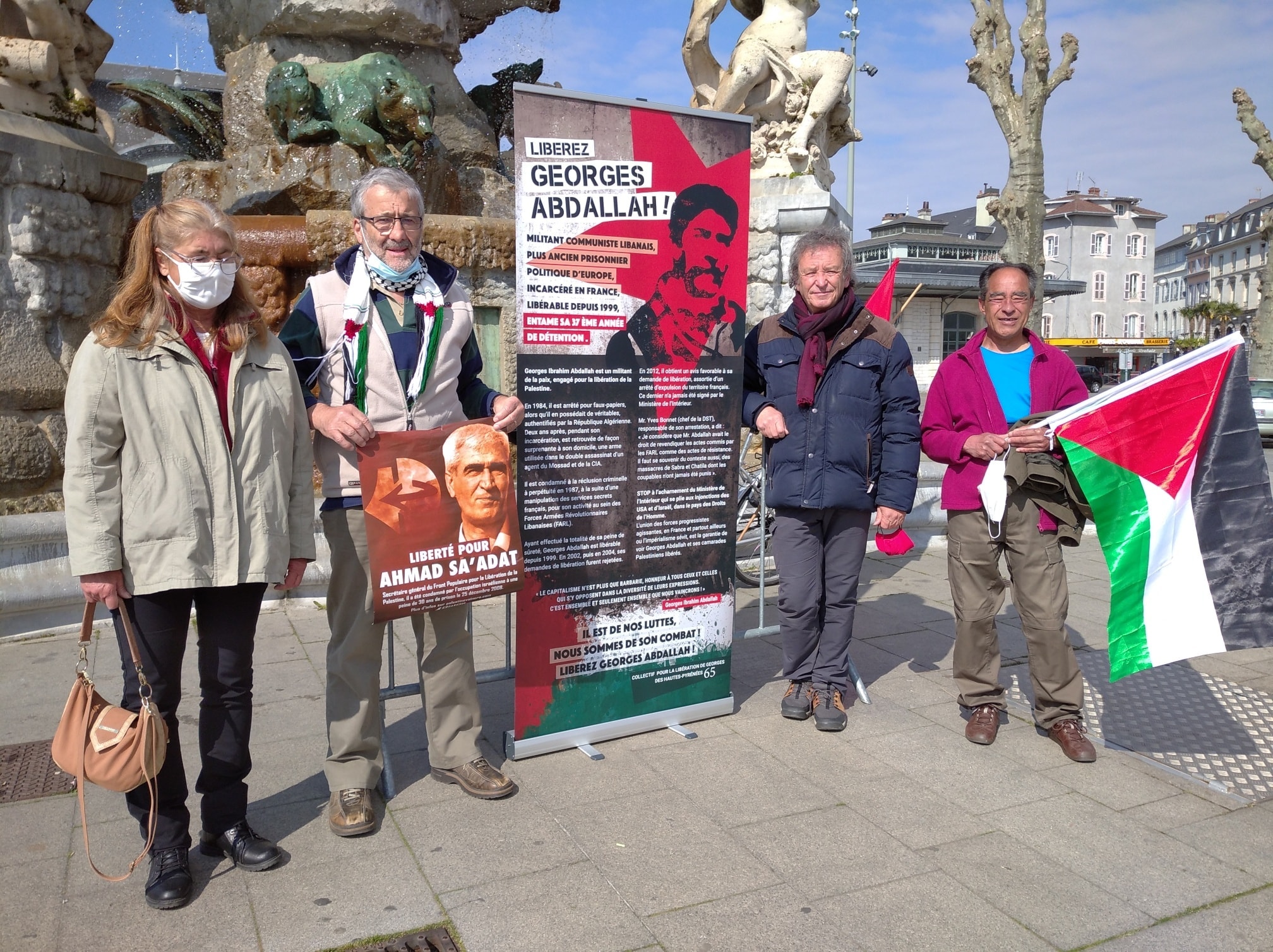 In Tarbes, France, the Collectif 65 pour la libération de Georges Abdallah gathered to mark Palestinian Prisoners’ Day on 17 April, displaying signs and banners highlighting the imprisonment of Palestinian leader Ahmad Sa’adat and Georges Ibrahim Abdallah, imprisoned for over 36 years in French prisons.