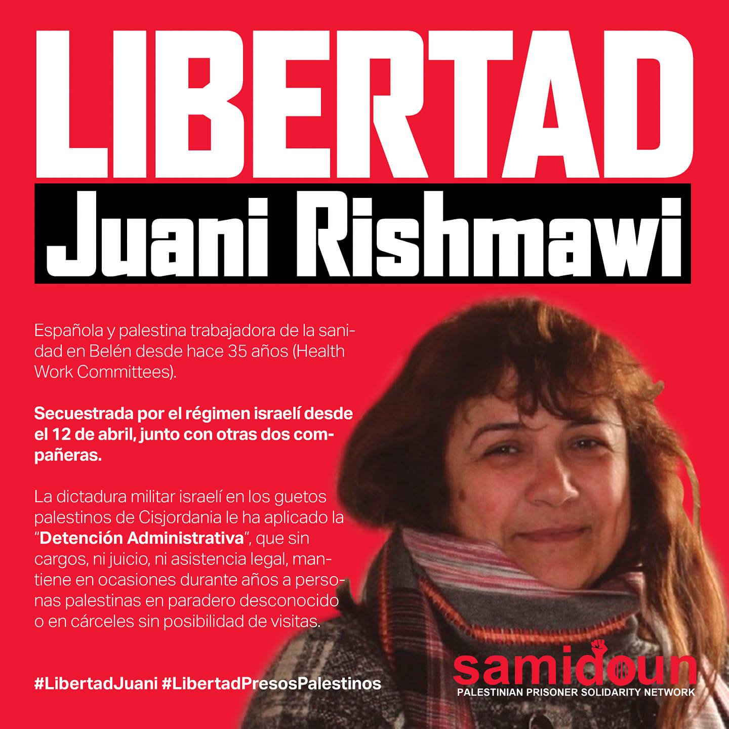 The health worker Juana Ruiz, Juani Rishmawi, Spanish and Palestinian, has been imprisoned by Israel since April 13 along with two other colleagues from the Health Work Committees. After several weeks without charges, Israel has revealed the grotesque, and is going to accuse her of running a terrorist financial plot. Juani has obtained funds from NGOs and Spanish regional governments so that Palestinian primary care centers have been able to continue treating basic health in Palestine during these decades, and especially during the COVID pandemic.