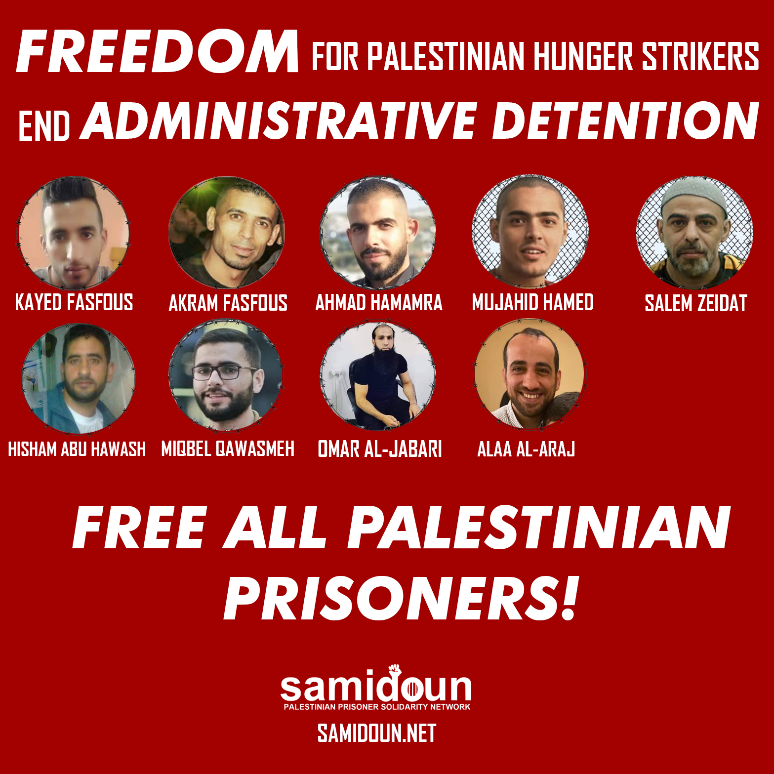 Samidoun Palestinian Prisoner Solidarity Network urges all supporters of Palestine to take action to support these Palestinian hunger strikers and all Palestinian prisoners struggling for freedom, for their own lives and for the Palestinian people. They are confronting the system of Israeli oppression on the front lines, with their bodies and their lives, to bring the system of administrative detention to an end. Take these actions below to stand with the hunger strikers and the struggle for liberation of Palestine, from the river to the sea!