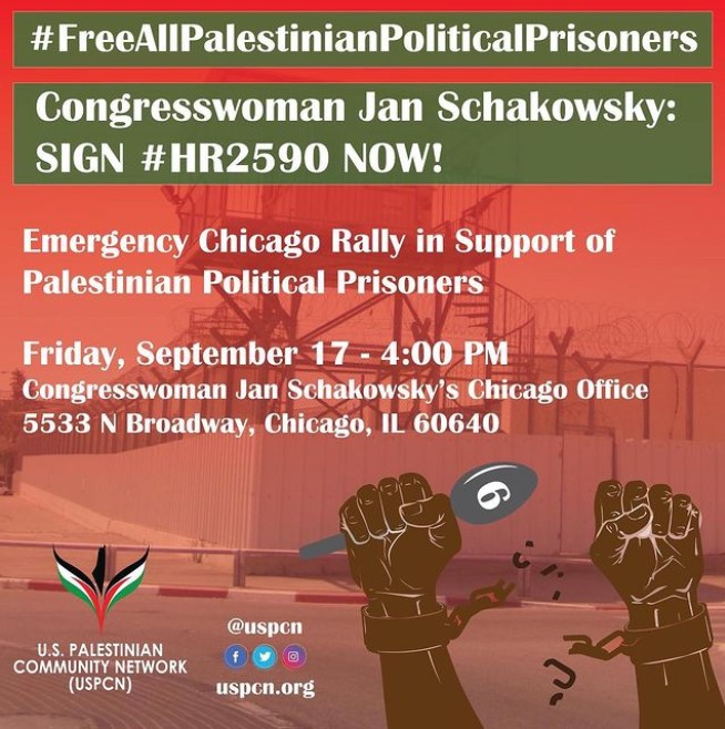 HICAGO CALL TO ACTION: Join us THIS FRIDAY at 4:00 PM in front of @janschakowsky ‘s Chicago office (5533 N Broadway) to stand in support of ALL Palestinian Political Prisoners and demand @janschakowsky sign on to #HR2590 (LINK IN BIO)