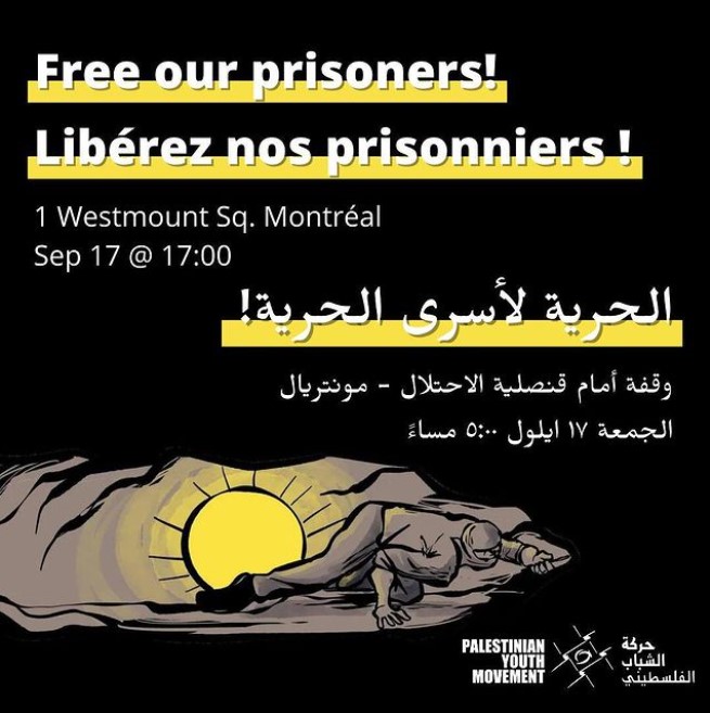 Rejoignez le chapitre du Mouvement de la Jeunesse Palestinienne (Palestinian Youth Movement) à Tiohtià:ke (Montréal) pour soutenir les prisonniers palestiniens qui ont toujours été en première ligne de la lutte palestinienne pour la liberté et la libération.