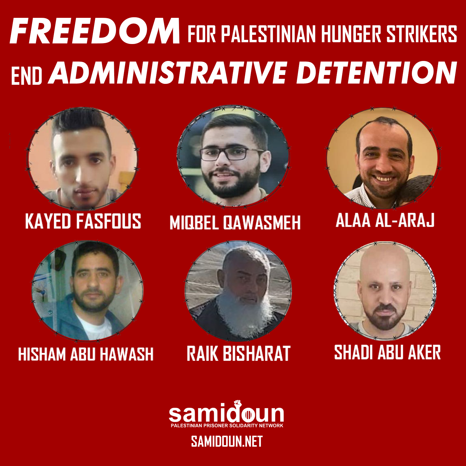 Samidoun Palestinian Prisoner Solidarity Network urges all supporters of Palestine to take action to support these Palestinian hunger strikers and all Palestinian prisoners struggling for freedom, for their own lives and for the Palestinian people. They are confronting the system of Israeli oppression on the front lines, with their bodies and their lives, to bring the system of administrative detention to an end. Take these actions below to stand with the hunger strikers and the struggle for liberation of Palestine, from the river to the sea!