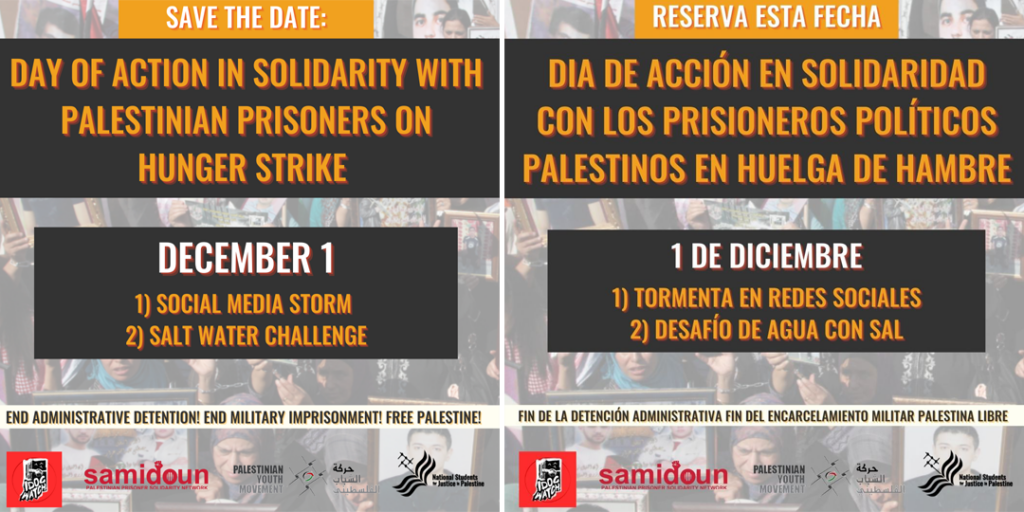 1. Join the social media day of action on December 1st! Start Tweeting and posting on Instagram with the hashtag #FreeThemAll #Strike4Freedom at 10 am Pacific, 1 pm Eastern, 7 pm central Europe, 8 pm Palestine. CLICK HERE FOR THE SOCIAL MEDIA TOOLKIT