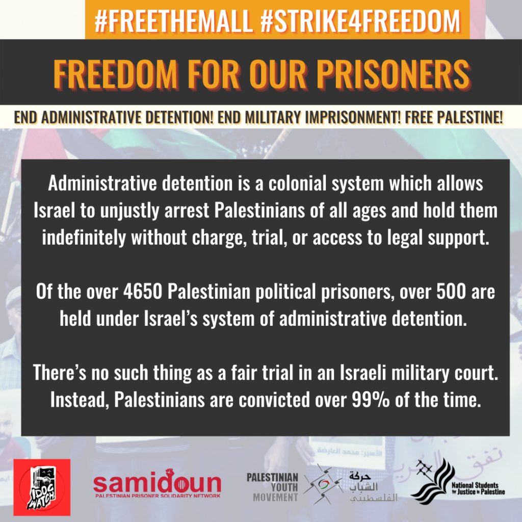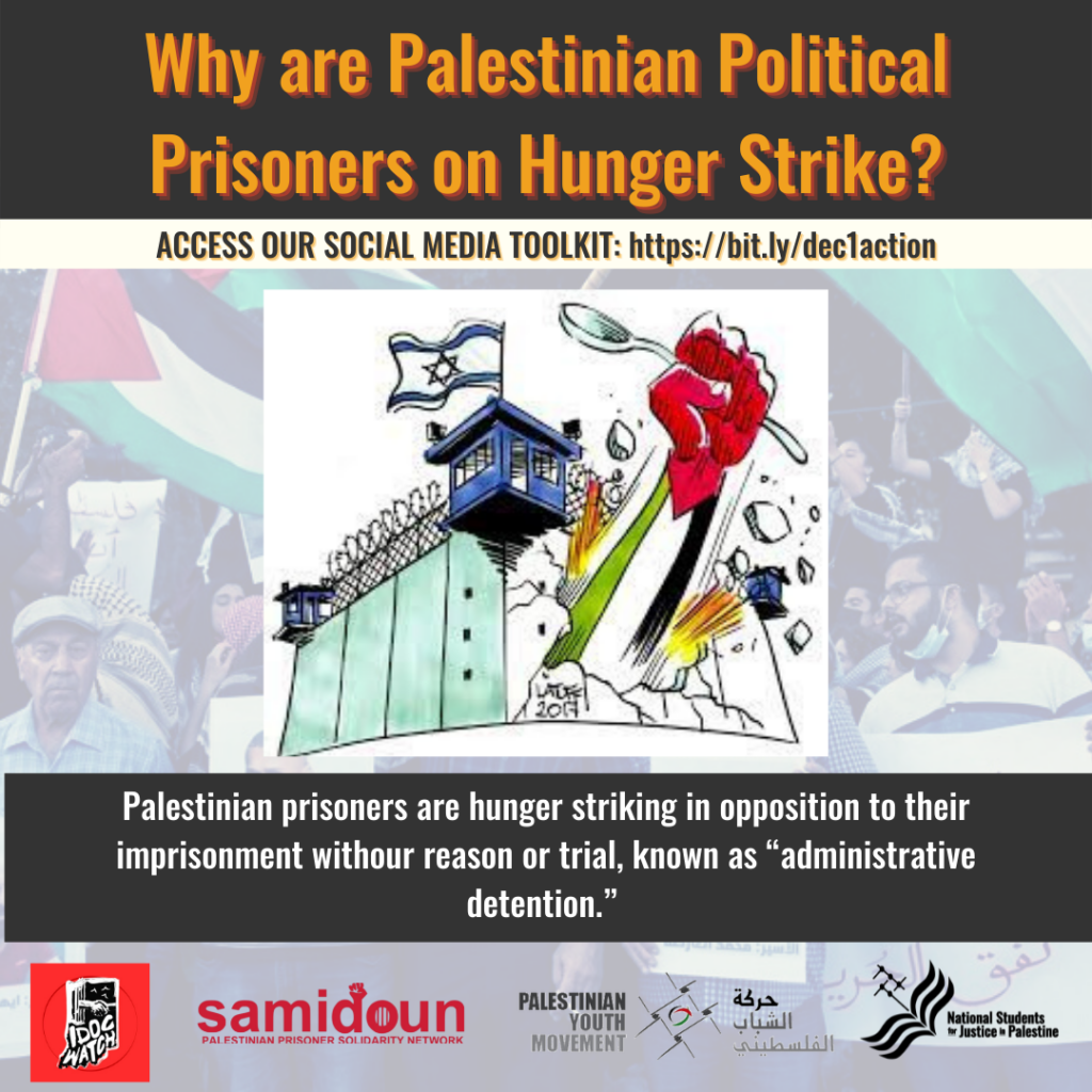 On December 1st, 2021, National Students for Justice in Palestine, Samidoun, Palestinian Youth Movement and IDOC Watch call on all institutions and individuals committed to freedom, justice, and equality to take to social media in solidarity with Palestinian political prisoners on hunger strike!