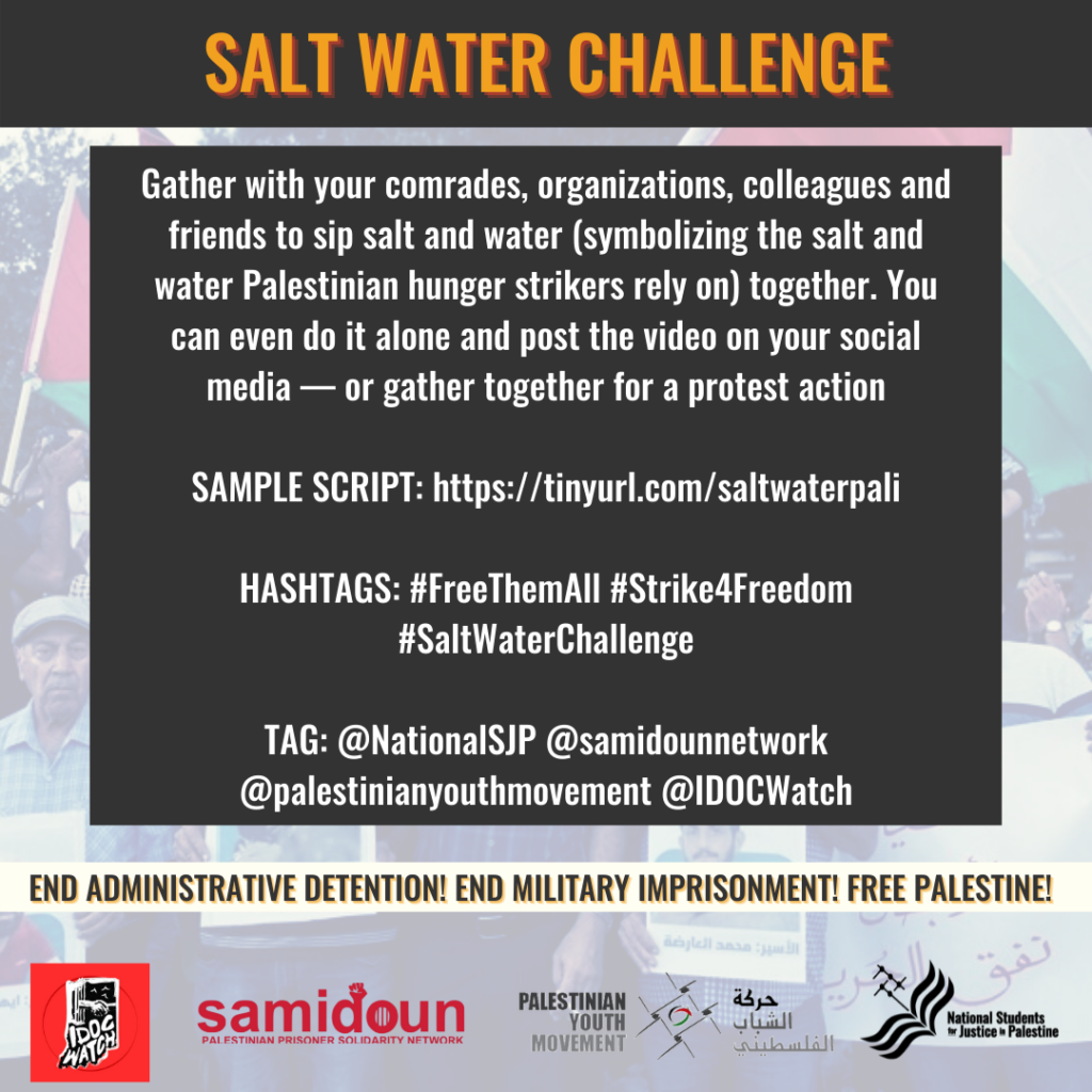 2. Take the salt water challenge! Gather with your comrades, organizations, colleagues and friends to sip salt and water (symbolizing the salt and water Palestinian hunger strikers rely on) together. You can even do it alone and post the video on your social media — or gather together for a protest action. CLICK HERE FOR A SAMPLE SCRIPT IN ENGLISH AND ARABIC, WITH SPANISH TRANSLATIONS COMING SOON