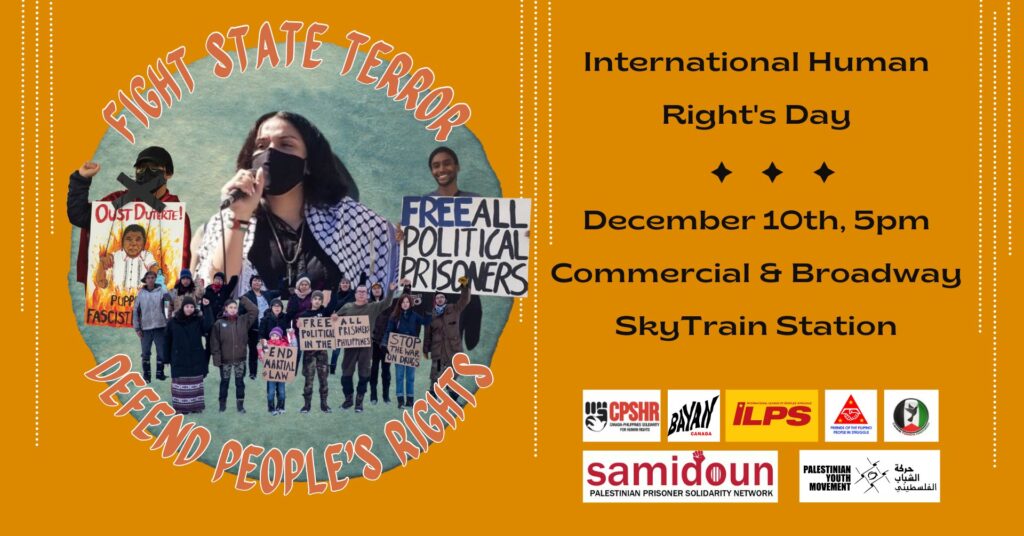 On the International Day for Human Rights, join local organizers from the International League of People’s Struggles (ILPS) for a solidarity rally and hear reports from peoples struggles for justice and liberation across Turtle Island, Philippines, Palestine, Chile, India, and beyond. Come out to denounce state violence and UNITE for People’s Rights & Justice!