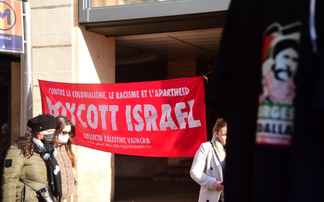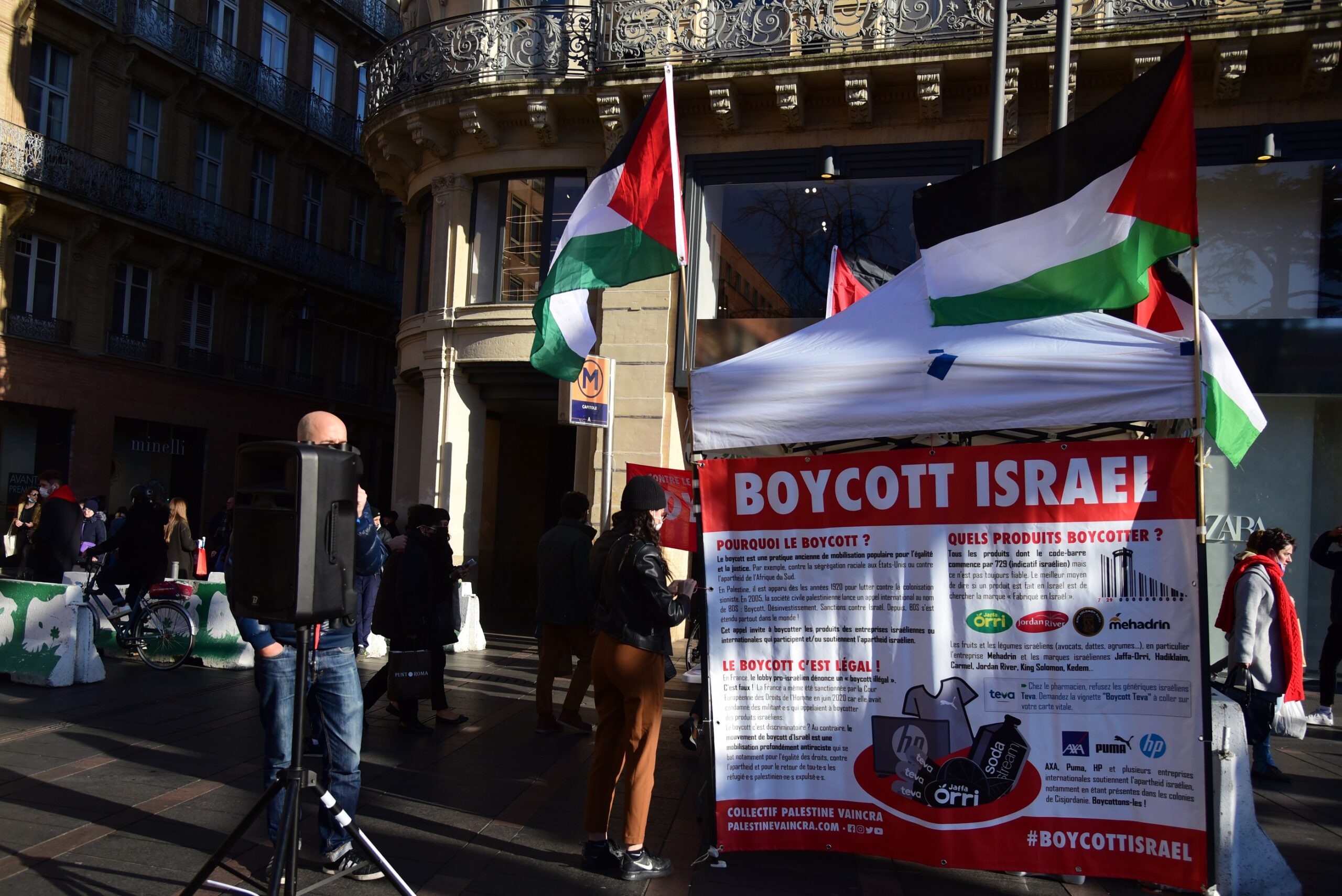 On Wednesday, 22 December 22, the Collectif Palestine Vaincra organized a Palestine Stand outside the Capitole metro station in Toulouse, France, under a beautiful winter sun. The slogan of the stand — “For Christmas, I’m boycotting Israel” — raised awareness among holiday shoppers out in the center city about the importance of boycotting Israeli corporations and the international companies that support and profit from colonialism, racism and apartheid.