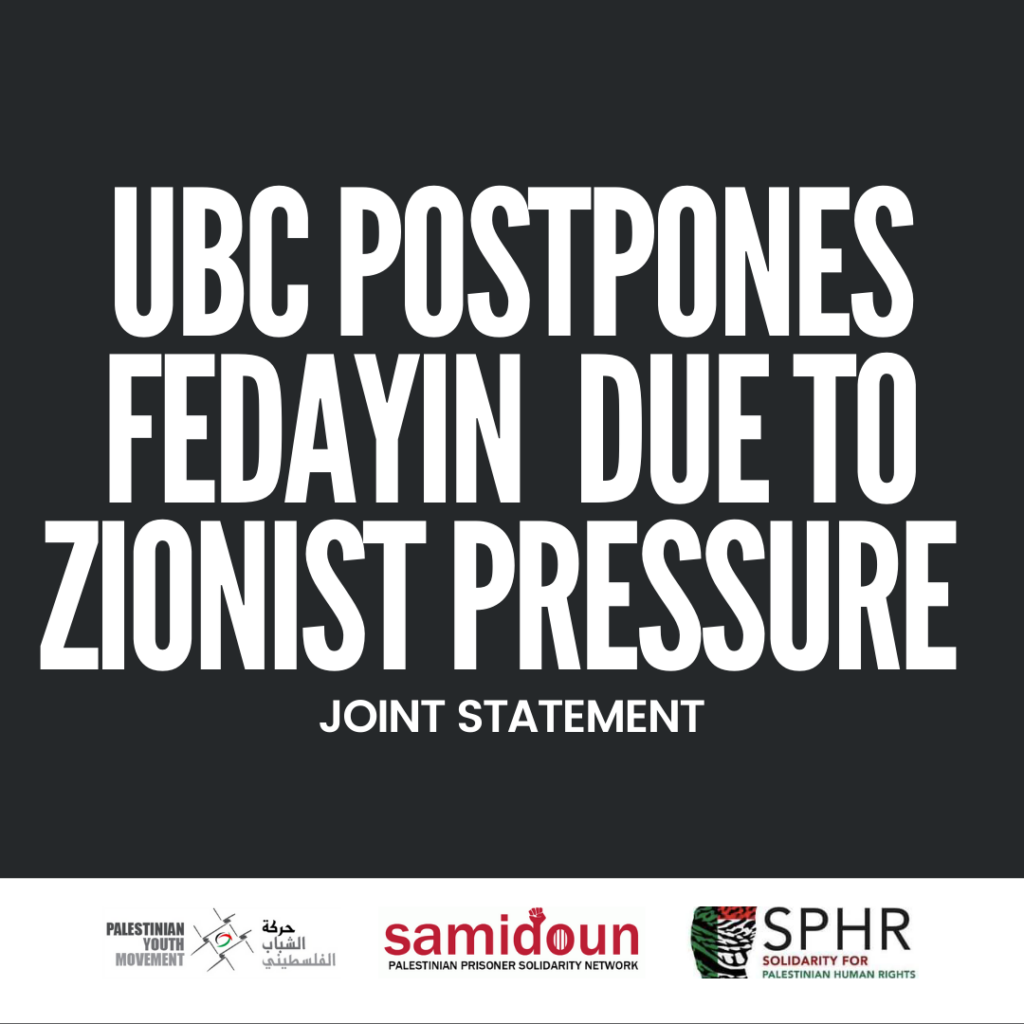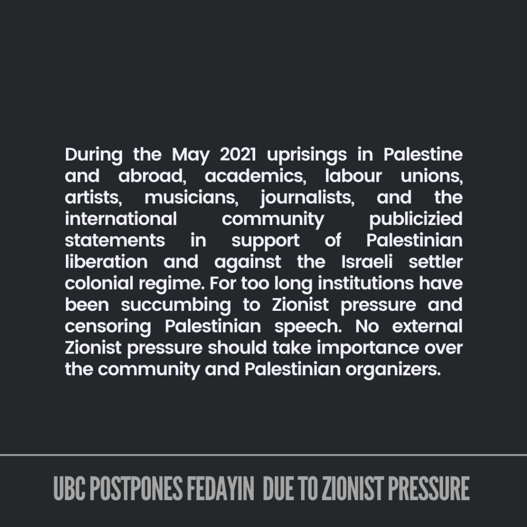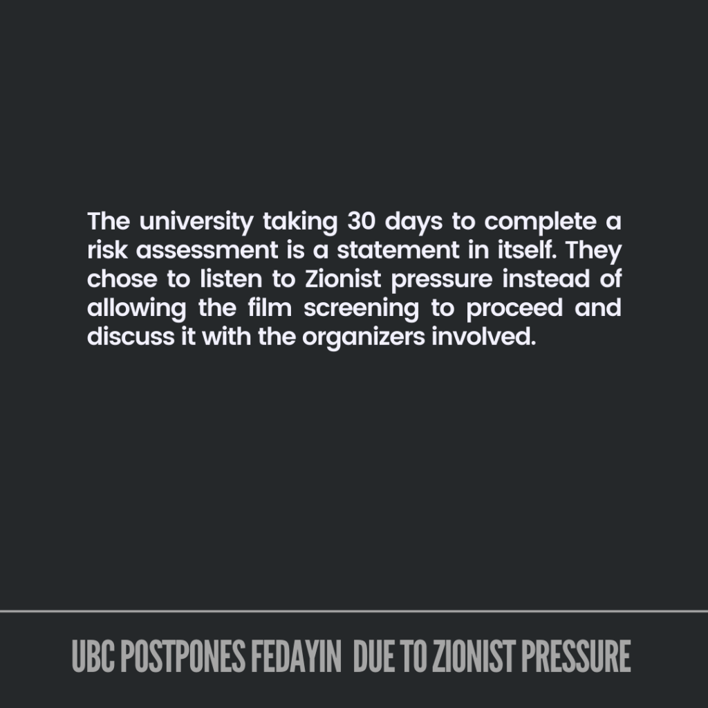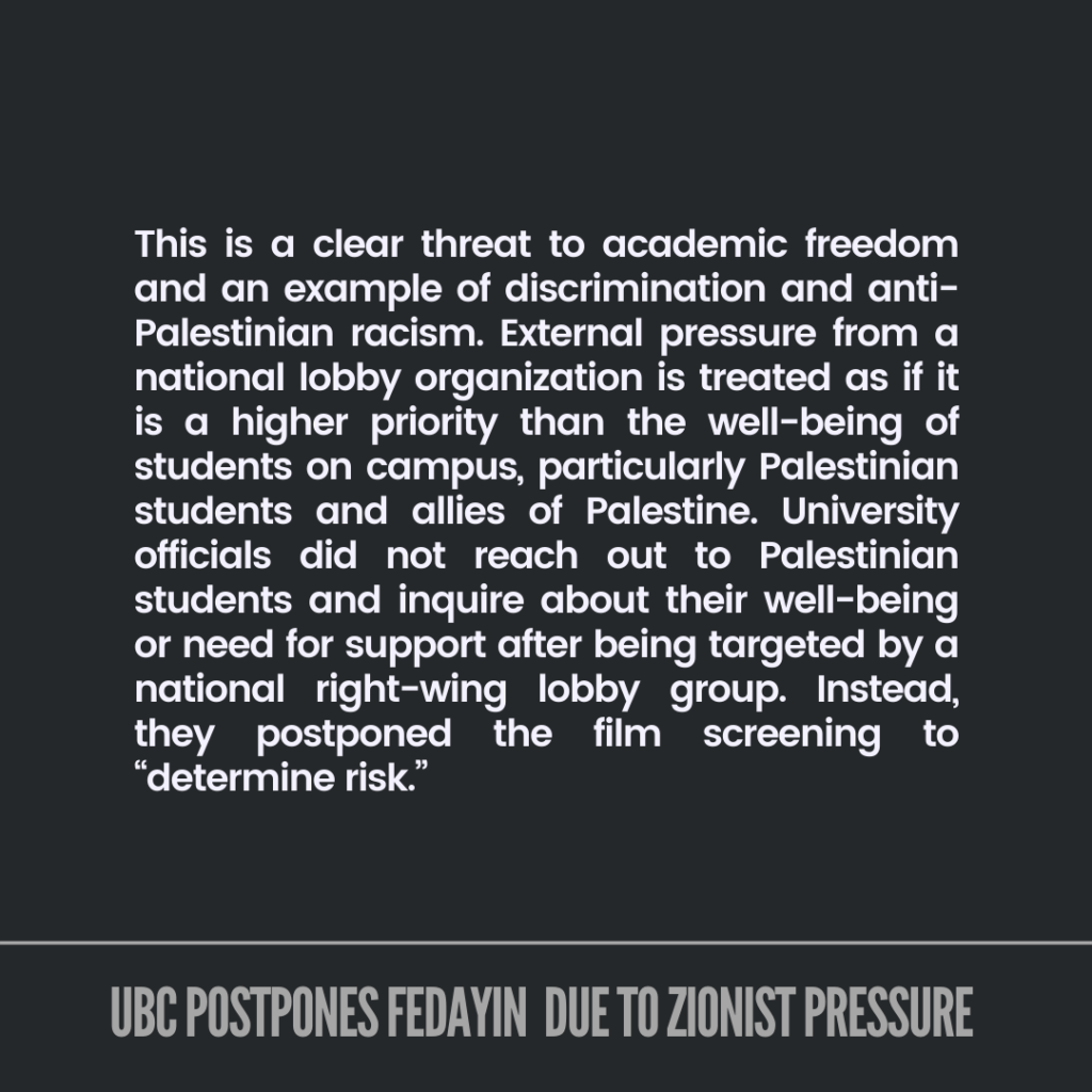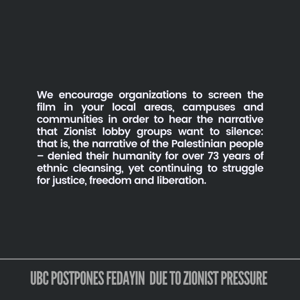 In addition, we expect that the administration provide support to Palestinian students on campus and facilitate the screening of “Fedayin” rather than allowing anti-Palestinian racism to delay, suppress and silence our expression. We will announce the new date for the film at UBC as soon as possible, and we will not stop organizing.