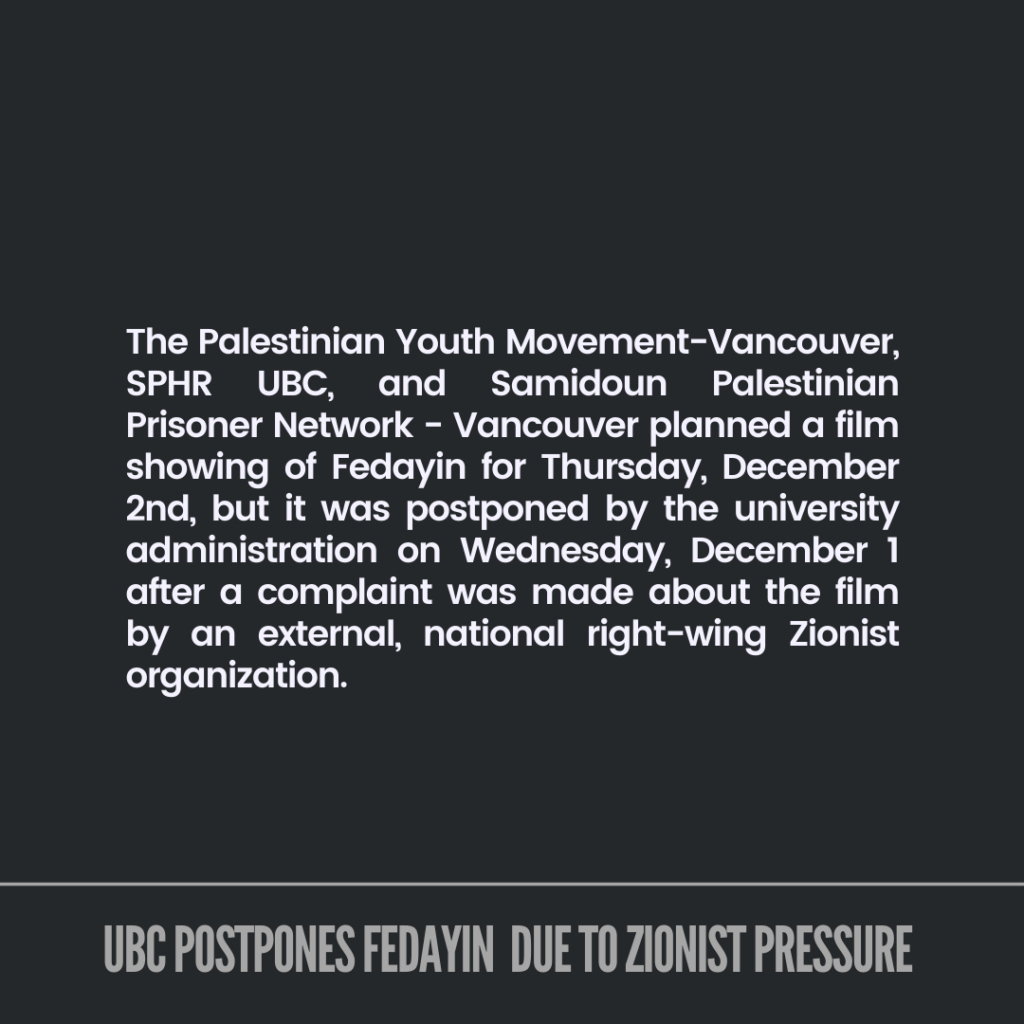The Palestinian Youth Movement-Vancouver, SPHR UBC, and Samidoun Palestinian Prisoner Network – Vancouver planned a film showing of Fedayin: Georges Abdallah’s Fight for Thursday, December 2nd, but it was postponed by the university administration on Wednesday, December 1 after a complaint was made about the film by an external, national right-wing Zionist organization.