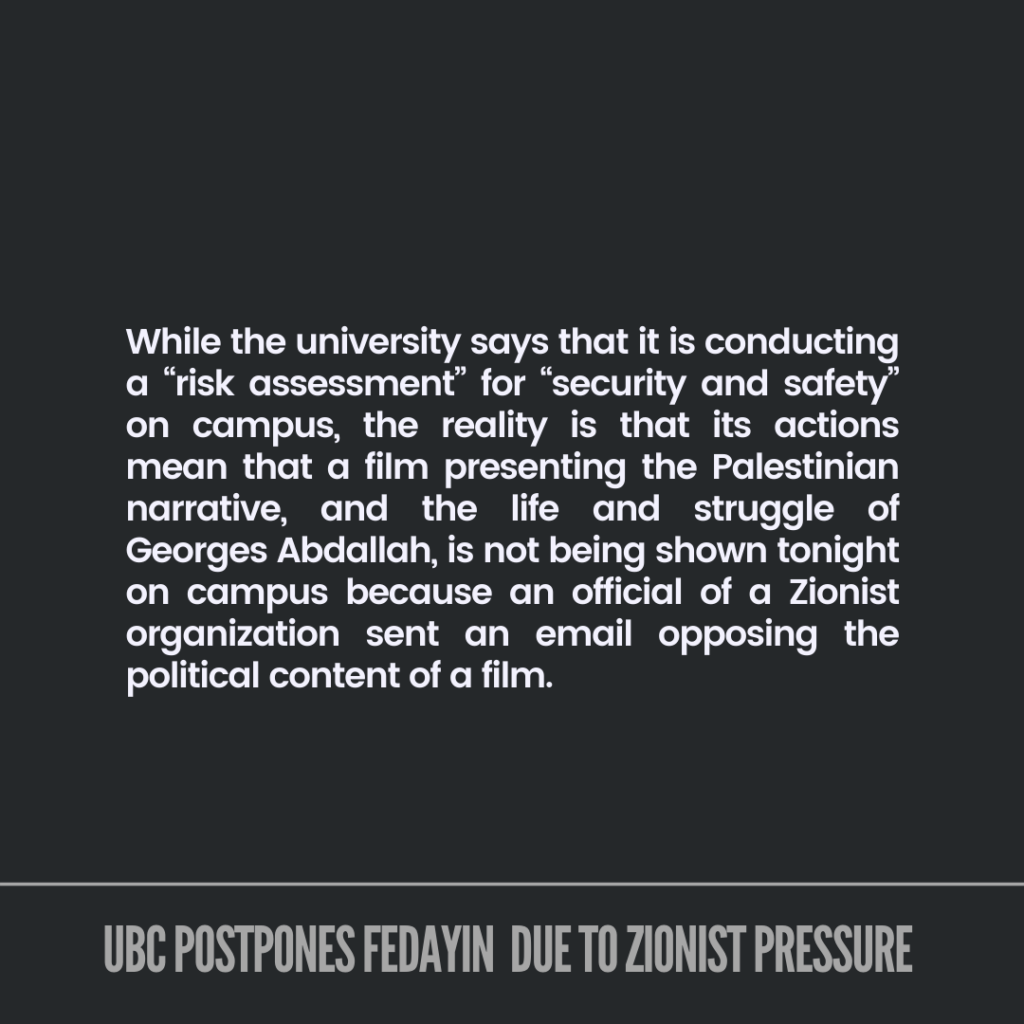 While the university says that it is conducting a “risk assessment” for “security and safety” on campus, the reality is that its actions mean that a film presenting the Palestinian narrative, and the life and struggle of Georges Abdallah, is not being shown tonight on campus because an official of a Zionist organization sent an email opposing the political content of a film. This film has been screened in multiple venues and university campuses across Canada and around the world and has been selected by multiple prestigious film festivals for screening. UBC is the only venue where such an incident of silencing and suppression has occurred.