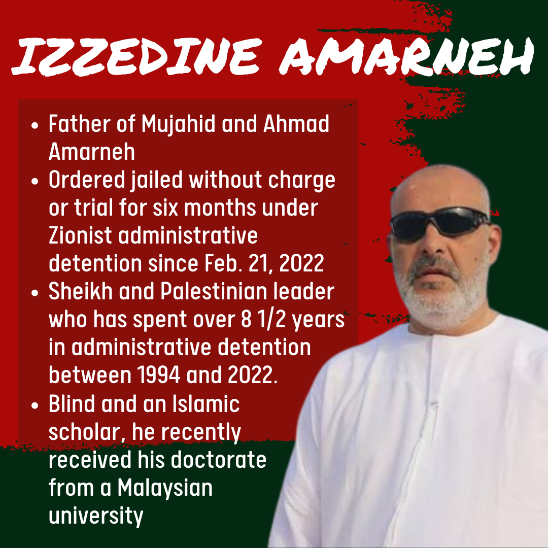 Sheikh Izzedine Amarneh, a blind Islamic religious scholar who recently received his doctorate from a university in Malaysia, was seized from the family home in Yabad on 21 February 2022. He was almost immediately ordered to six months in administrative detention, Israeli imprisonment without charge or trial.