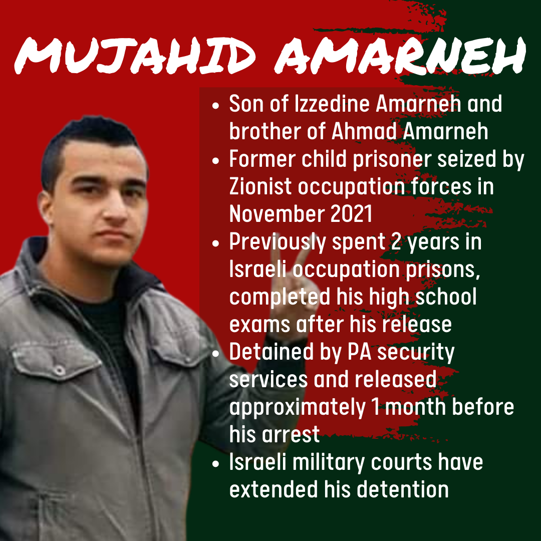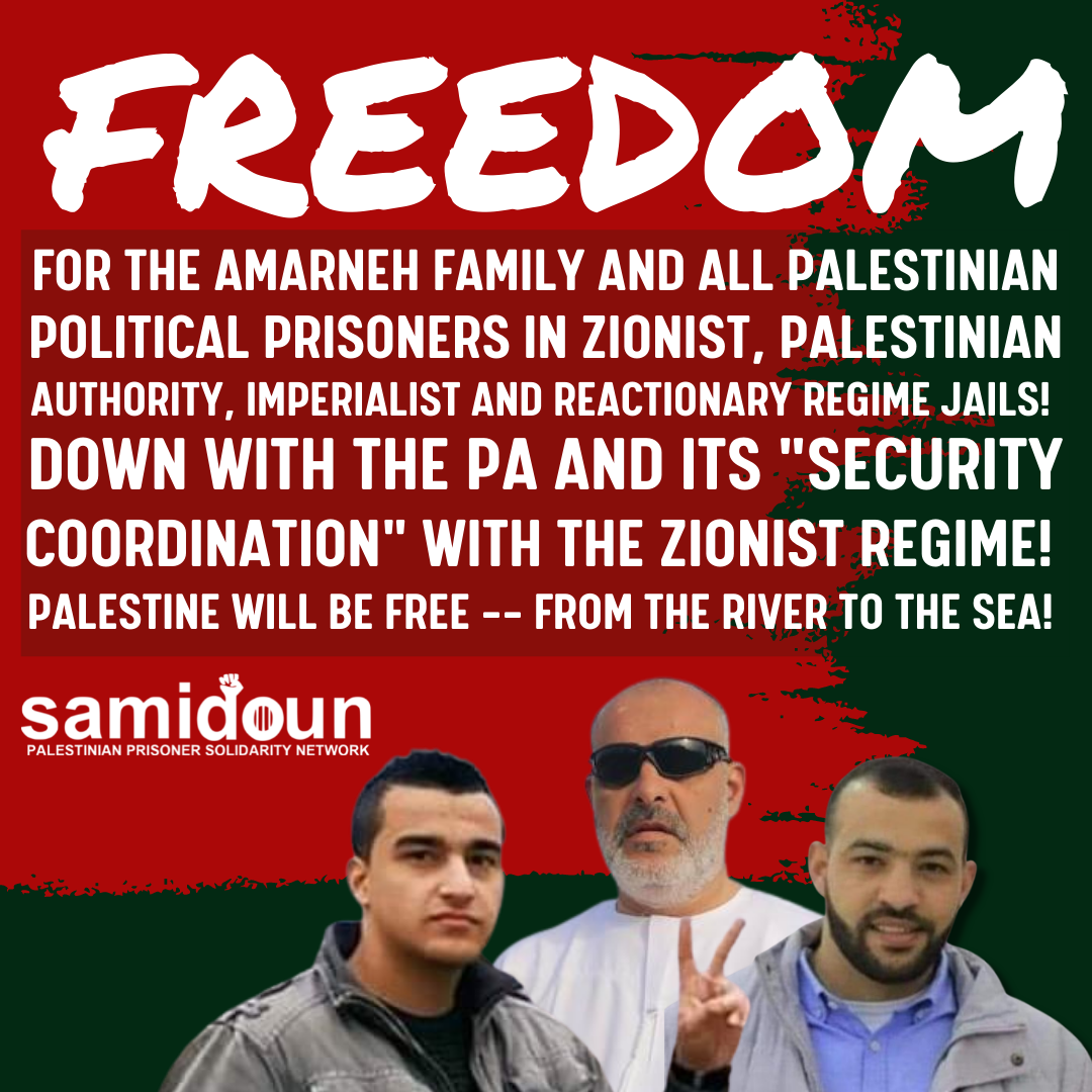 Samidoun Palestinian Prisoner Solidarity Network urges the immediate release of the Amarneh family and all Palestinian prisoners in Zionist, Palestinian Authority, imperialist and reactionary regime prisons. All 4,650 Palestinians behind bars reflect the struggle of the Palestinian people for freedom, justice and liberation throughout occupied Palestine, from the river to the sea.