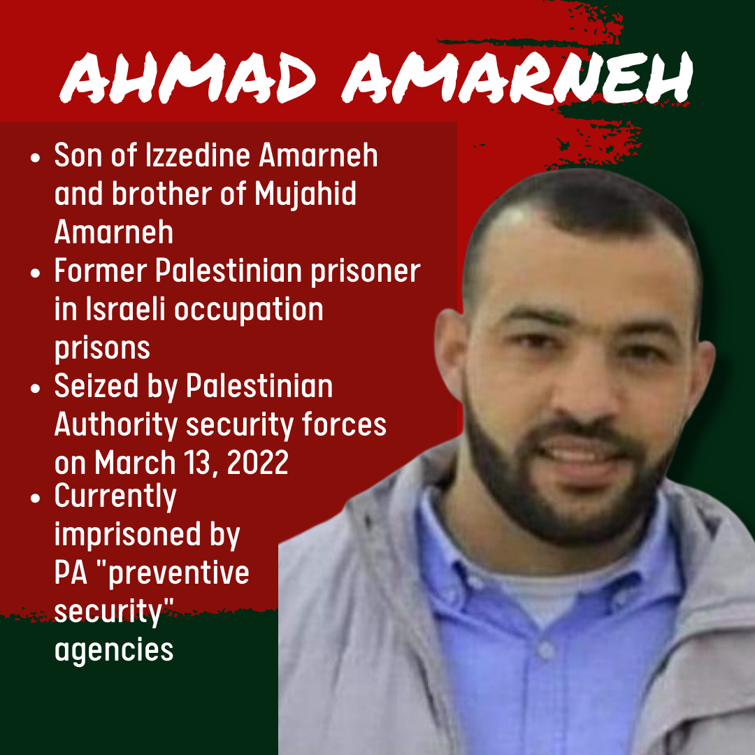 The targeting of the Amarneh family is not an individual or unique case, but an example of the colonial weapon of imprisonment used to target the Palestinian people and their resistance. It is also an example of the role of the Palestinian Authority as a security subcontractor for the Israeli occupation, carrying out policies of political detention in tandem with Israeli priorities for repressing the resistance movement.
