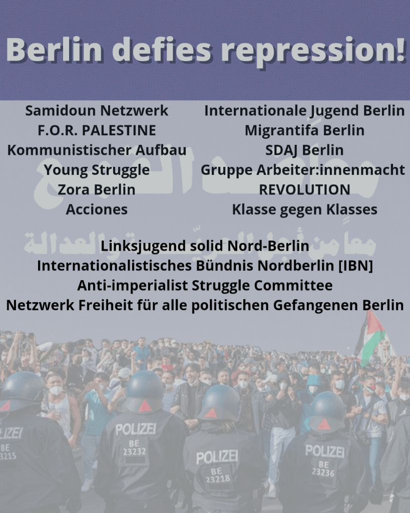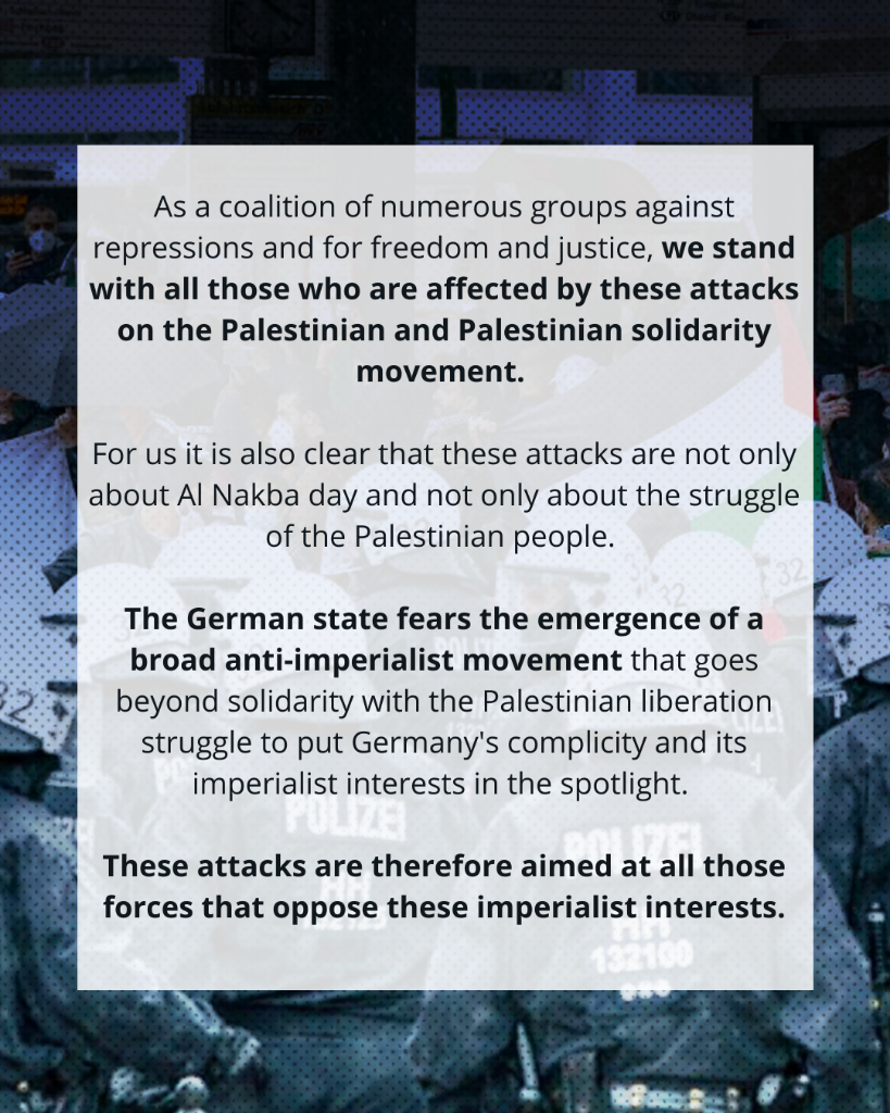 As an alliance of numerous groups against repressions and for freedom and justice, we stand with all those who are affected by these attacks on the Palestinian and Palestinian solidarity movement. For us it is also clear that these attacks are not only about Al Nakba day and not only about the struggle of the Palestinian people. The German state fears the emergence of a broad anti-imperialist movement that goes beyond solidarity with the Palestinian liberation struggle to put Germany’s complicity and its imperialist interests in the spotlight. These attacks are therefore aimed at all those forces that oppose imperialist interests.