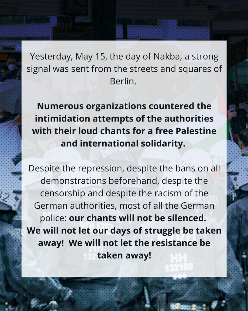 Yesterday, May 15, the day of Nakba, a strong signal was sent from the streets and squares of Berlin. Numerous organizations countered the intimidation attempts of the authorities with their loud chants for a free Palestine and international solidarity. Despite the repression, despite the bans on all demonstrations beforehand, despite the censorship and despite the racism of the German authorities, most of all the German police: our chants will not be silenced. We will not let our days of struggle be taken away! We will not let the resistance be taken away!