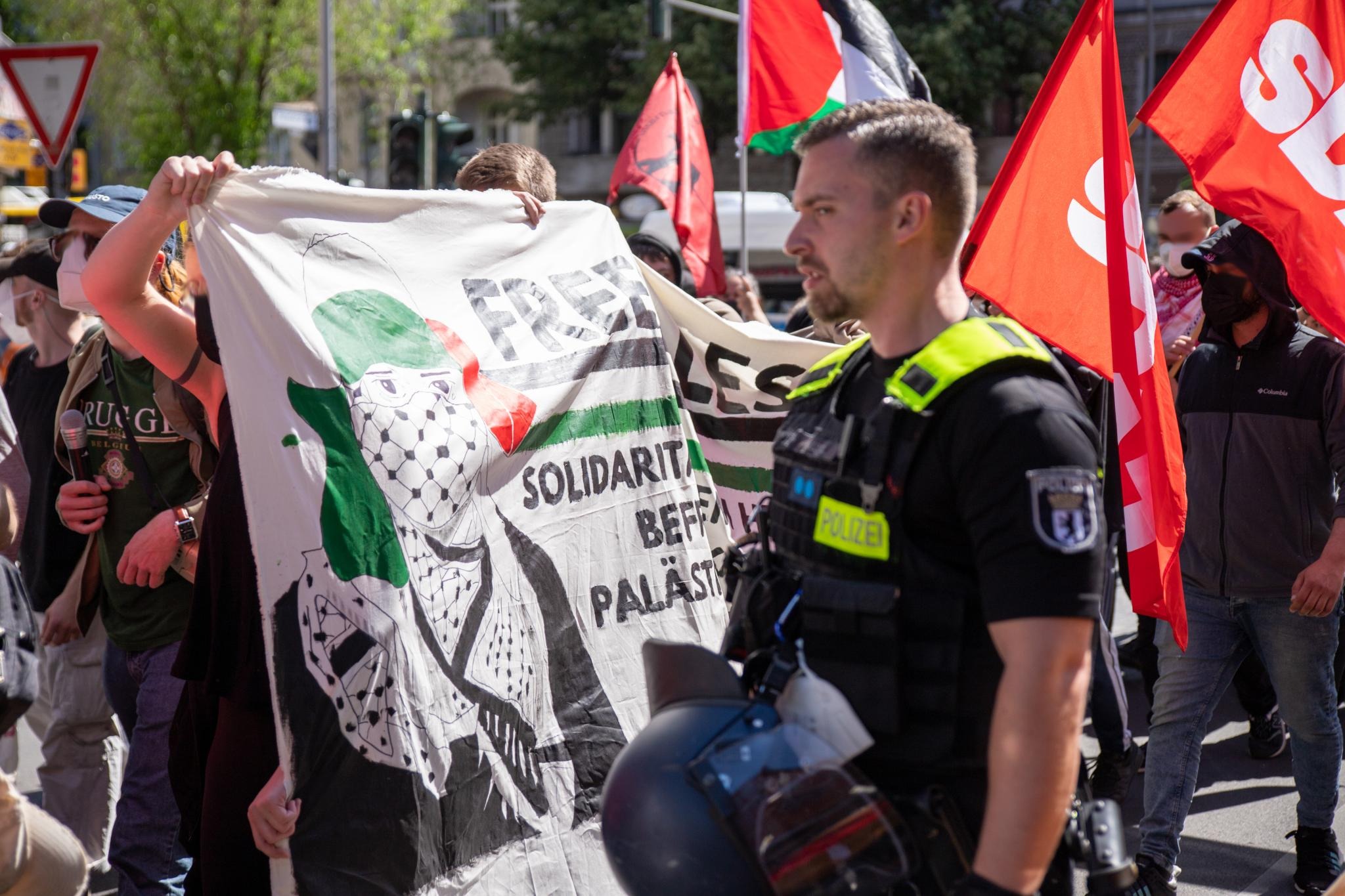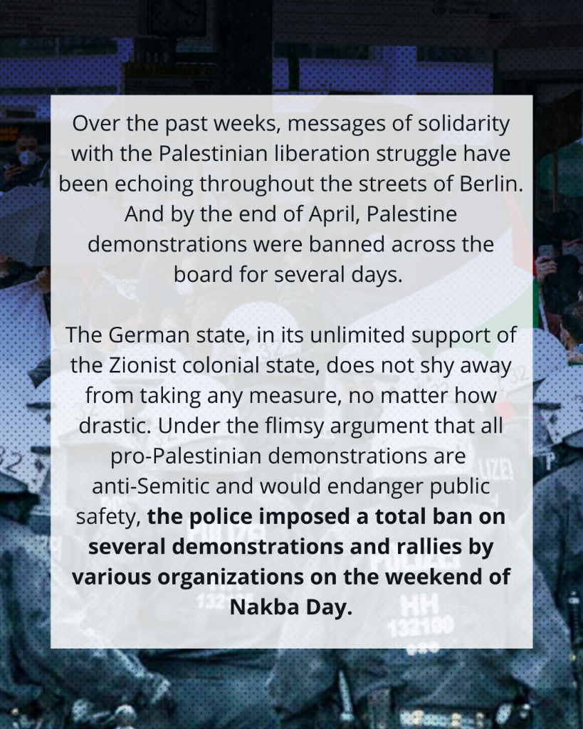 Over the past weeks, messages of solidarity with the Palestinian liberation struggle have been echoing throughout the streets of Berlin. And by the end of April, Palestine demonstrations were banned across the board for several days. The German state, in its unlimited support of the Zionist colonial state, does not shy away from taking any measure, no matter how drastic. Under the flimsy argument that all pro-Palestinian demonstrations are anti-Semitic and would endanger public safety, the police imposed a total ban on several demonstrations and rallies by various organizations on the weekend of Nakba Day.