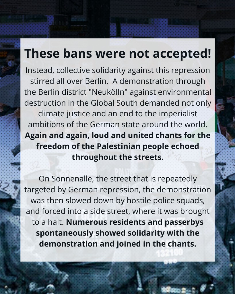 These bans were not accepted! Instead, collective solidarity against this repression stirred all over Berlin. A demonstration through the Berlin district “Neukölln” against environmental destruction in the Global South demanded not only climate justice and an end to the imperialist ambitions of the German state around the world. Again and again, loud and united chants for the freedom of the Palestinian people echoed throughout the streets. On Sonnenallee, the street that is repeatedly targeted by German repression, the demonstration was then slowed down by hostile police squads, and forced into a side street, where it was brought to a halt. Numerous residents and passers-by spontaneously showed solidarity with the demonstration and joined in the chants.