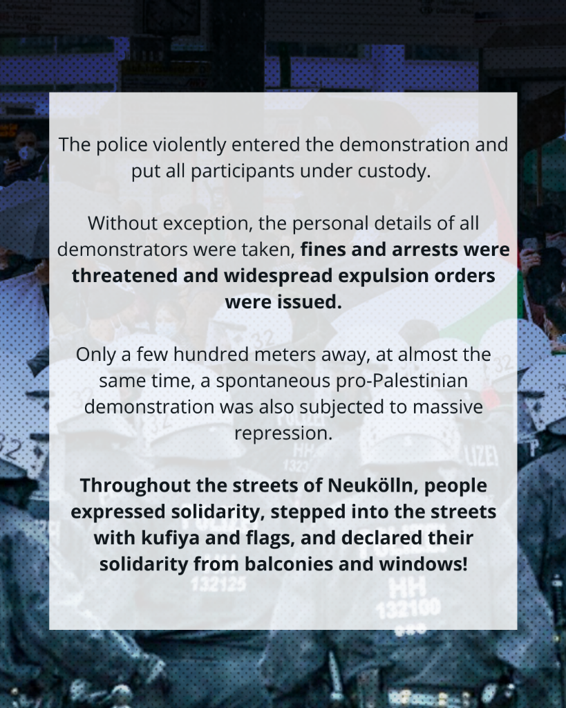 The police violently entered the demonstration and put all participants under custody. Without exception, the personal details of all demonstrators were taken, fines and arrests were threatened and widespread expulsion orders were issued. Only a few hundred meters away, at almost the same time, a spontaneous pro-Palestinian demonstration was also subjected to massive repression. Throughout the streets of Neukölln, people clearly expressed on which side they stand, stepped into the streets with kufiya and flags, and declared their solidarity from balconies and windows!