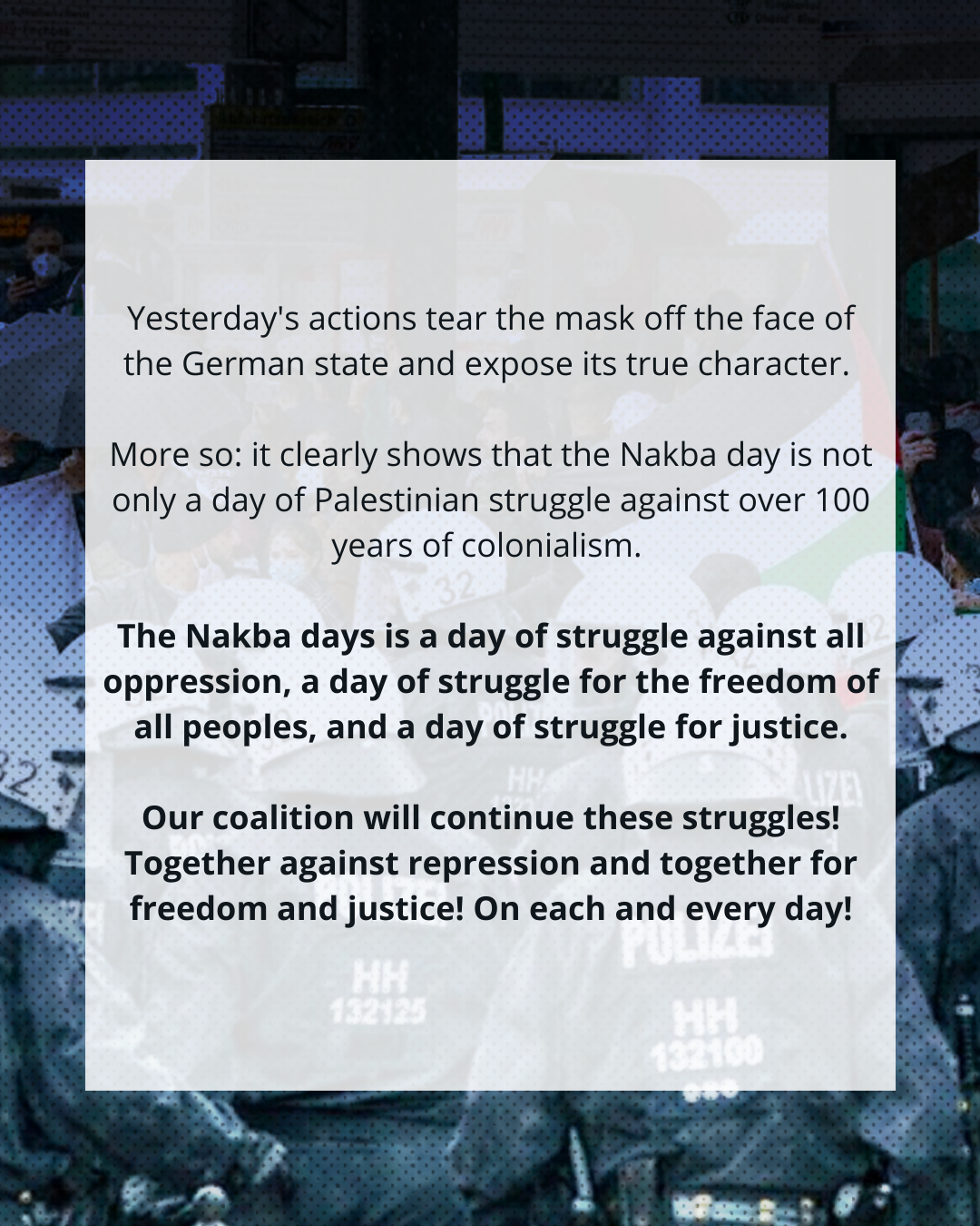 Yesterday’s actions tear the mask off the face of the German state and expose its true character. More so: it clearly shows that the Nakba day is not only a day of Palestinian struggle against over 100 years of colonialism. The Nakba days is a day of struggle against all oppression, a day of struggle for the freedom of all peoples, and a day of struggle for justice. Our alliance will continue these struggles! Together against repression and together for freedom and justice! On each and every day!
