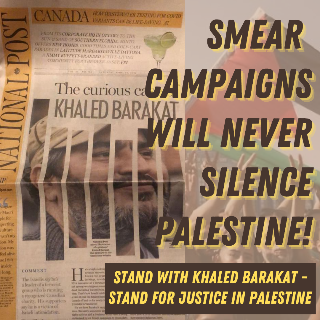 Samidoun Palestinian Prisoner Solidarity Network condemns in the strongest terms the smear campaign targeting Palestinian Canadian leftist writer and community organizer Khaled Barakat as well as the work of Samidoun, by the right-wing National Post, intentionally forwarding the agenda of pro-Israel lobby organizations in Canada. It is clear that this is not a random attack; the content, far from its packaging, is in reality warmed-over retreads of various attacks from the Israeli occupation regime and Zionist publications over the years, with an added attempt to sensationally criminalize and stigmatize Palestinian organizing and activism in Canada.