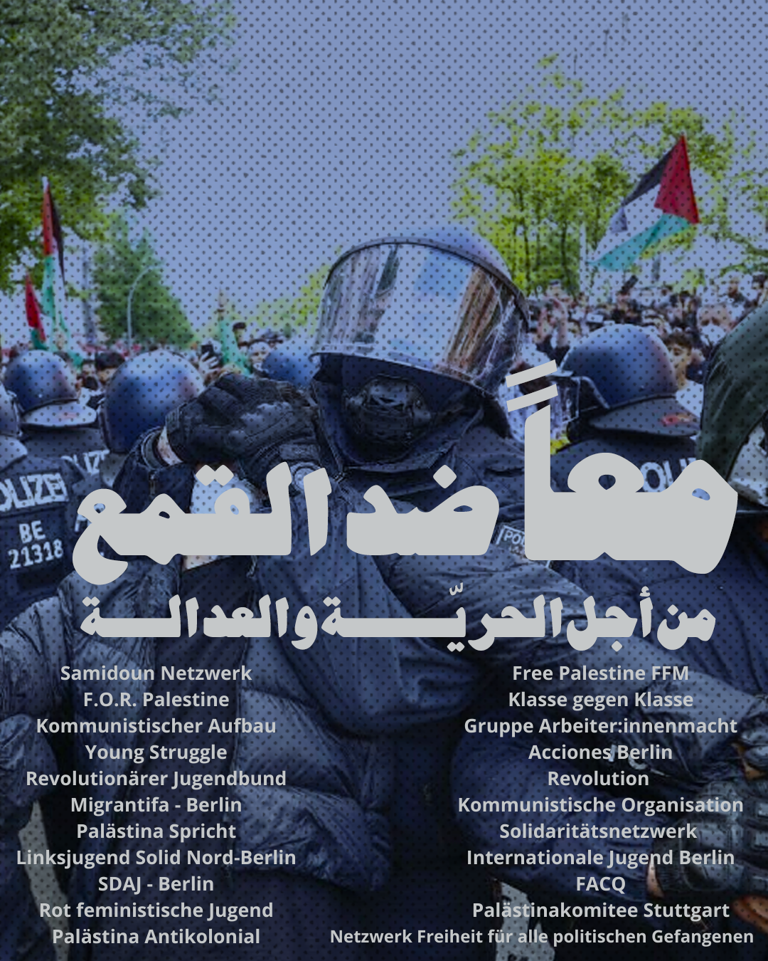 Vi avvisar detta förbud! Nakba dagen är för vår kamp och vi står fast och enade mot detta förtryck. Medan den tyska staten och media försöker sönderfalla och splittra oss. Vi förenar oss och försvarar vår gemensamma rätt att skicka meddelanden som ger genklang på Berlins gator till våra bröder och systrar i Palestina och världen: Vår kamp för frihet är en rättvis kamp! Vår kamp mot kolonialism och imperialism är en kamp för rättvisa. Vi uppmanar alla solidaritetsrörelser med Palestina och alla kämpar mot kolonialism och imperialism runt om i världen att gå med oss och stötta oss mot förtrycket.