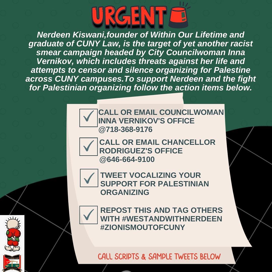 TAKE ACTION: Join the Twitter storm today and/or email & call @InnaVernikov and @ChancellorCUNY to tell them:#WeStandWithNerdeen #ZionismOutOfCUNY #WeChargeDefamation#FreePalestine pic.twitter.com/DGXg9vozJg
