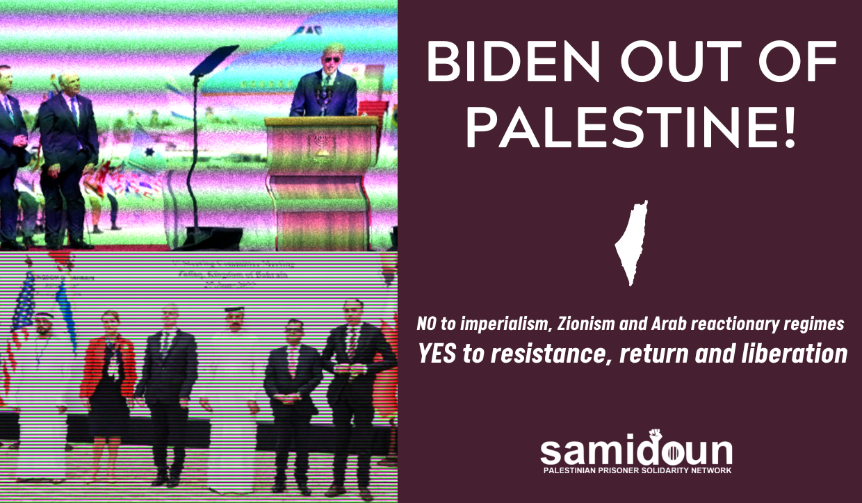 Samidoun Palestinian Prisoner Solidarity Network denounces the visit of United States president Joe Biden to occupied Palestine. This visit and Biden’s entire trip to the region makes clear the alliance of enemies confronted by the Palestinian people: Zionism, imperialism and its subcontractors, and Arab reactionary regimes, as well as the Israeli state. Biden’s trip to occupied Palestine underlines U.S. imperialism’s strategic alliance with the Zionist settler-colonial project in Palestine, built on an edifice of stolen Palestinian land, in order to further attack the Palestinian resistance and all the forces of resistance in the region.