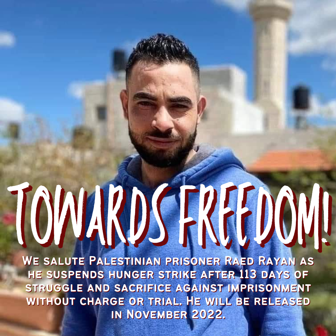 Samidoun Palestinian Prisoner Solidarity Network salutes Raed Rayan and the Palestinian people and liberation movement as a whole on the accomplishments of their great steadfastness and commitment to struggle in the most difficult of conditions.