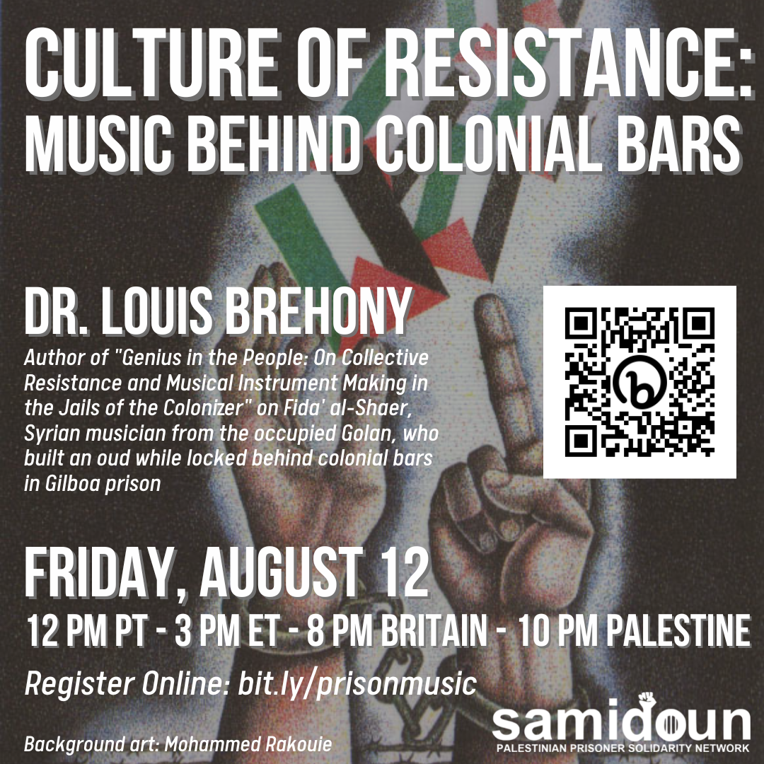Join Samidoun for a webinar with Dr. Louis Brehony, the author of “Genius in the People: On Collective Resistance and Musical Instrument Making in the Jails of the Colonizer” on Fida’ al-Shaer, Syrian musician from the occupied Golan, who built an oud while locked behind colonial bars in Gilboa prison.