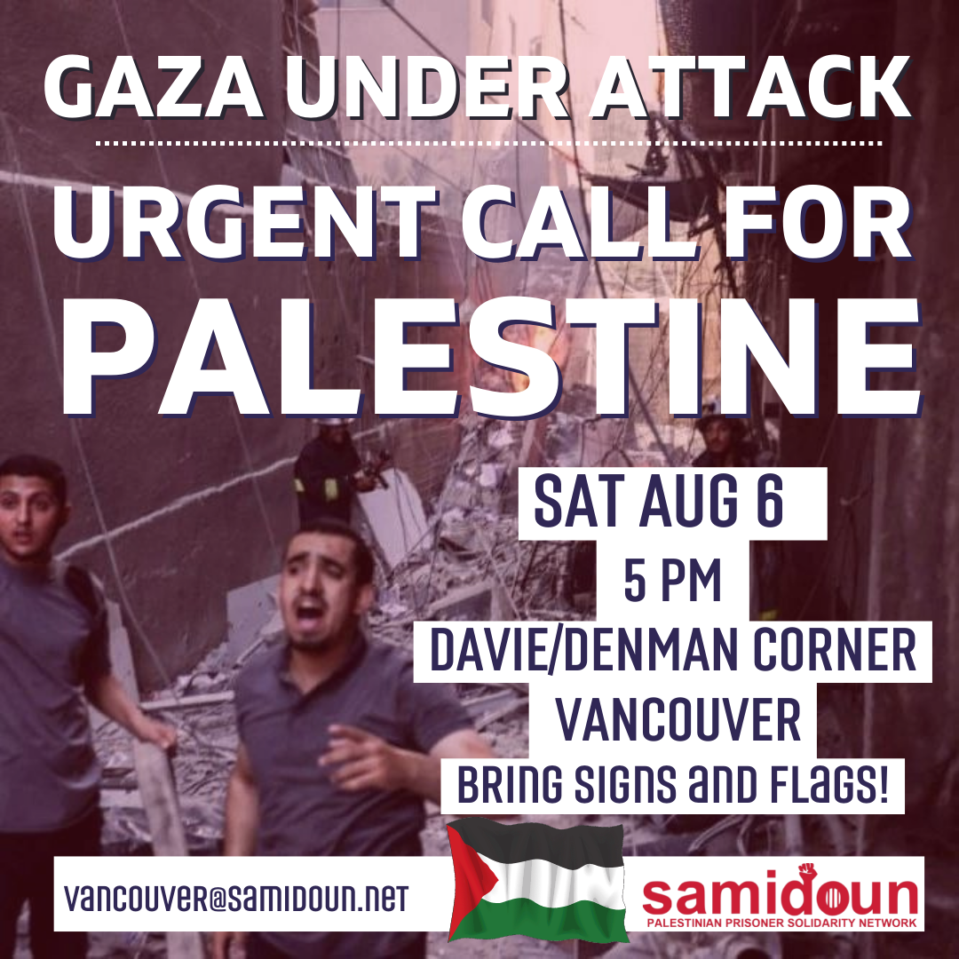 All organizaions and individuals are invited to join us for an emergency stand for Gaza on Saturday, August 6 at 5 pm at the Davie/Denman corner in Vancouver. Join us to speak out for Palestine!